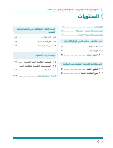العلوم البيئية - الصف الحادي عشر - الفصل الدراسي األول: كتاب الطالبxالمقدمة .................................... xiكيف تستخدم هذه السلسلة ............. xiiiكيف تستخدم هذا الكتاب ................ xvالوحدة األولى: مقدمة في اإلدارة البيئية٢٠ .............................. االستدامة 1-١٢١ ...............................الماء دورة ٢-١٢٤ ............................البيئية النظم 3-١الوحدة الثانية: البحوث البيئية وجمع البيانات٥١ .......................... العلمي المنهج 1-٢٢-٢ جمع البيانات البيئية .................... ٥٨الوحدة الثالثة: التفاعالت في النظم البيئية البحرية٨٨ .............................. التفاعالت 1-٣٩٠ ....................... التغذية عالقات 2-٣١٠١ ........................المغذيات دورات ّ 3-٣الوحدة الرابعة: التصنيف٤-1 تصنيف الكائنات الحية البحرية ...... ١٢١٤-2 المجموعات الرئيسية للكائنات الحية البحرية ................................ ١٢٥قائمة المصطلحات ....................... ١٥٥ المحتويات