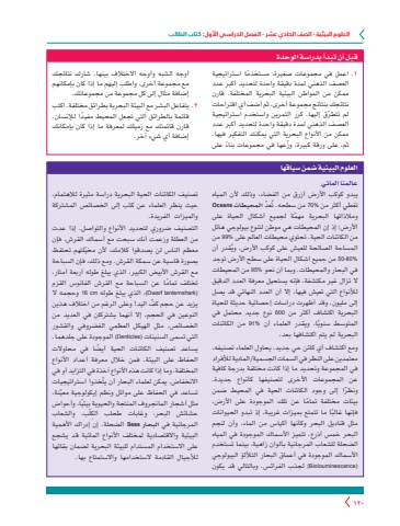 العلوم البيئية - الصف الحادي عشر - الفصل الدراسي األول: كتاب الطالب120العلوم البيئية ضمن سياقهاعالمنا المائييبدو كوكب األرض أزرق من الفضاء، وذلك ألن المياه تغطي أكثر من p من سطحه. تُ ّعد المحيطـات Oceansّ ومالذاتها البحرية مهمة لجميع أشكال الحياة على األرض؛ إذ إن المحيطات هي موطن لتنوع بيولوجي هائل من الكائنات الحية. تحتوي محيطات العالم على من ُقدر أن المساحة الصالحة للعيش على كوكب األرض، وي-50 من جميع أشكال الحياة على سطح األرض توجد في البحار والمحيطات. وبما أن نحو من المحيطات ال تزال غير مكتشفة، فإنه يستحيل معرفة العدد الدقيق لألنواع التي تعيش فيها، إال أن العدد النهائي قد يصل إلى مليون. وقد أظهرت دراسات إحصائية حديثة للحياة البحرية اكتشاف أكثر من 600 نوع جديد محتمل في ً المتوسط سنويا، ويقدر العلماء أن من الكائنات البحرية لم يتم اكتشافها بعد. ومع اكتشاف أي كائن حي جديد، يحاول العلماء تصنيفه، معتمدين على النظر في السمات الجسمية/المادية لألفراد في المجموعة وتحديد ما إذا كانت مختلفة بدرجة كافية عن المجموعات األخرى لتصنيفها كأنواع جديدة. ً ونظرا إلى وجود الكائنات الحية في المحيط ضمن ً بيئات مختلفة تماما عن تلك الموجودة على األرض، ً فإنها غالبا ما تتمتع بميزات غريبة، إذ تبدو الحيوانات مثل قناديل البحر وكأنها أكياس من الماء، وأن لنجم البحر خمس أذرع. تتميز األسماك الموجودة في المياه الضحلة للشعاب المرجانية بألوان زاهية، بينما تستخدم األسماك الموجودة في أعماق البحار التأللؤ البيولوجي (Biolouminescence (لجذب الفرائس. وبالتالي قد يكون تصنيف الكائنات الحية البحرية دراسة مثيرة لالهتمام، حيث ينظر العلماء عن كثب إلى الخصائص المشتركة والميزات الفريدة.التصنيف ضروري لتحديد األنواع والتواصل. إذا عدت من العطلة وزعمت أنك سبحت مع أسماك القرش، فإن ّ معظم الناس لن يصدقوا كالمك، ألن مخيلتهم تحتفظ بصورة قاسية عن سمكة القرش. ومع ذلك، فإن السباحة مع القرش األبيض الكبير، الذي يبلغ طوله أربعة أمتار، ً تختلف تماما عن السباحة مع القرش الفانوس القزم (lanternshark Dwarf ،(الذي يبلغ طوله cm 16 وحجمه ال ّ يزيد عن حجم كف اليد! وعلى الرغم من اختالف هذين النوعين في الحجم، إال أنهما يشتركان في العديد من الخصائص، مثل الهيكل العظمي الغضروفي والقشور التي تسمى السنينات (Denticles (الموجودة على جلدهما.ً يساعد تصنيف الكائنات الحية أيضا في محاوالت الحفاظ على البيئة. فمن خالل معرفة أعداد األنواع المختلفة، وما إذا كانت هذه األنواع آخذة في التزايد أو في ّ االنخفاض، يمكن لعلماء البحار أن يتخذوا استراتيجيات ّ تساعد في الحفاظ على موائل ونظم إيكولوجية معينة، ً مثل أشجار المانجروف المنتجة والحيوية بيئيا، وأحواض ْب، والشعاب ِ حشائش البحر، وغابات طحلب الكلالمرجانية في البحـار Seas الضحلة. إن إدراك األهمية البيئية واالقتصادية لمختلف األنواع المائية قد يشجع على االستخدام المستدام للبيئة البحرية لضمان بقائها لألجيال القادمة الستخدامها واالستمتاع بها.قبل أن تبدأ بدراسة الوحدة1 ً .اعمل في مجموعات صغيرة، مستخدما استراتيجية العصف الذهني لمدة دقيقة واحدة لتحديد أكبر عدد ممكن من المواطن البيئية البحرية المختلفة. قارن نتائجك بنتائج مجموعة أخرى، ثم أضف أي اقتراحات ّ لم تتطرق إليها. كرر التمرين واستخدم استراتيجية العصف الذهني لمدة دقيقة واحدة لتحديد أكبر عدد ممكن من األنواع البحرية التي يمكنك التفكير فيها. ّ ثم، على ورقة كبيرة، وز ً عها في مجموعات بناء على أوجه الشبه وأوجه االختالف بينها. شارك نتائجك مع مجموعة أخرى، واطلب إليهم ما إذا كان بإمكانهم إضافة مثال إلى كل مجموعة من مجموعاتك.2 .يتفاعل البشر مع البيئة البحرية بطرائق مختلفة. اكتب ً قائمة بالطرائق التي تجعل المحيط مفيدا لإلنسان. قارن قائمتك مع زميلك لمعرفة ما إذا كان بإمكانك إضافة أي شيء آخر.