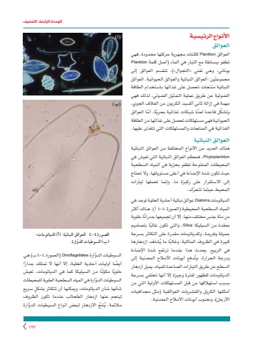 الوحدة الرابعة: التصنيف127األنواع الرئيسية العوالقالعوالق Plankton كائنات مجهرية حركتها محدودة، فهي تطفو ببساطة مع التيار في الماء )أصل كلمة Planktonيوناني، وهي تعني »التجوال«(. تنقسم العوالق إلى مجموعتَين: العوالق النباتية والعوالق الحيوانية. العوالق النباتية منتجات تحصل على غذائها باستخدام الطاقة الضوئية عن طريق عملية التمثيل الضوئي، لذلك فهي مهمة في إزالة ثاني أكسيد الكربون من الغالف الجوي، ّ وتشك ّ ل قاعدة لعد ّ ة شبكات غذائية بحري ّ ة. أما العوالق الحيوانية فهي مستهلكات تحصل على غذائها من الطاقة الغذائية في المنتجات والمستهلكات التي تتغذى عليها.العوالق النباتيةهناك العديد من األنواع المختلفة من العوالق النباتية Phytoplankton .فمعظم العوالق النباتية التي تعيش في ّ المحيطات المفتوحة تطفو بحرية في المياه السطحية حيث تكون شدة اإلضاءة في أعلى مستوياتها، وال تحتاج إلى االستقرار على ركيزة ما، وإنما تحملها تيارات ّ المحيط حيثما تتحرك.الدياتومات Diatoms عوالق نباتية أحادية الخلية توجد في المياه السطحية المحيطية )الصورة ٤-٤ أ(. هناك أكثر ً من مئة جنس مختلف منها، إال أن لجميعها جدرانا خلوية معقدة من السيليكا Silica ، ً والتي تكون غالبا بتصاميم جميلة وفريدة. وللدياتومات مقدرة على التكاثر بسرعة ُ َشاهد ازدهارها ً كبيرة في الظروف المثالية، وغالبا ما يفي الربيع. يحدث هذا عندما ترتفع شدة اإلضاءة ودرجة الحرارة، وتُدفع أيونات األمالح المعدنية إلى السطح عن طريق التيارات الصاعدة للمياه. يميل ازدهار الدياتومات للظهور لفترة وجيزة إال أنها تختفي بسرعة بسبب استهالكها من قبل المستهلكات األولية التي من أمثلتها الكريل والقشريات العوالقية )مثل مجدافيات األرجل(، ونضوب أيونات األمالح المعدنية.الصورة ٤-4 العوالق النباتية: )أ( الدياتومات؛ ّ )ب( السوطيات الدوارة.)ب()أ(ّ السوطيات الدوارة Dinoflagellates( الصورة ٤-٤ب( هيً أيض ً ا أوليات أحادية الخلية، إال أنها ال تمتلك جدارا ً خلوي ّ ا مكوًنا من السيليكا كما في الدياتومات. تعيش ّ السوطيات الدوارة في المياه السطحية العلوية للمحيطاتٍ شأنها شأن الدياتومات، ويمكنها أن تتكاثر بشكل سريع لينجم عنها ازدهار الطحالب عندما تكون الظروف ُ ِنت ُج ّ االزدهار لبعض أنواع السوطيات الدوارة مالئمة. ي