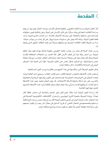 xiالمقدمة المقدمةتُ ّعد العلوم البيئية دراسة للعالم الطبيعي، ولكيفية تفاعل اإلنسان مع هذا العالم، يقوم بها من يهتم بدراسة الكائنات الحية في بيئته، ّ مركًزا على تأثير اإلنسان على البيئة، وعلى إمكانية تغيير سلوكياته للمساعدة في حمايتها والحفاظ على مواردها لألجيال القادمة. من الصعب تقديم تعريف واحد فقط للعلوم البيئية. وذلك ألنه يعمل على مستويات عديدة ويؤثر على كل جانب من جوانب حياتنا، ً بدء ّ ا من طريقة تكيف الكائنات البحرية مع محيطها وصوًل ّ إلى تلوث الغالف الجوي الذي يحيط بنا.يدرس علماء البيئة كل جانب من جوانب عالمنا الطبيعي، وكيفية تفاعله بهدف فهم عمل النظم البيئية، من أصغر بركة مياه إلى كوكب األرض ككل. ّثمة العديد من المجاالت المختلفة لإلدارة البيئية يرتكز كل مجال منها على معرفة أساسية، ولقد ّصمم كتاب الطالب ليتناسب مع بيئة سلطنة عمان واحتياجاتها، مع التركيز بشكل خاص على العلوم البحرية، ً نظرا إلى أهمية هذا الموطن ُ البيئي في الصناعة واالقتصاد داخل سلطنة عمان.يمكن تطبيق المعرفة التي ستكتسبها في هذا المنهج عبر نطاق واسع من المهن المستقبلية.ُستخدم كتاب األنشطة والتجارب العملية ككتاب داعم لكتاب الطالب، وسيتيح أمام الطلبة ً فرصا يللبحث ّ المعمق في الموضوعات المطروحة، فيساعدهم على تطوير مهاراتهم الرياضية والتحليلية ّم بتنفيذ بعض هذه األنشطة والتدريب على حل أسئلة مشابهة ألسئلة االمتحانات. قد يقوم المعلداخل الصف، أو يعطيها كواجب منزلي؛ وإذا توافر الوقت يمكن للطلبة إجراء هذه األنشطة بأنفسهم لتعزيز مهاراتهم الخاصة.تُ ّعد ً دراسة العلوم البيئية أمرا ً ملحا، فمع تأثير تغير المناخ، والحاجة إلى مصادر طاقة أكثر ّ تجد ًدا، وزيادة المعرفة بأهمية التنوع البيولوجي، واستمرار االكتشافات التكنولوجية الحديثة في هذا المجال، باتت حاجتنا اليوم إلى الوعي بالعلوم البيئية أكثر من أي وقت مضى. وسواء تابع الطلبة دراستهم وتخصصهم في المجال العلمي، أو قرروا الدخول في مجال آخر، يجب أن يكونوا جميعهم ً على دراية تامة بكيفية العمل معا لخلق مستقبل مستدام وناجح لسلطنة عمان.