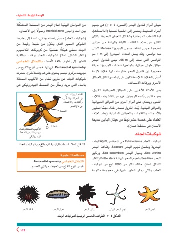 الوحدة الرابعة: التصنيف129تعيش أنواع قناديل البحر )الصورة ٤-٥ ج( في جميع أجزاء المحيط وتنتمي إلى الشعبة نفسها )الالسعات(، ّ كما الشعاب المرجانية وشقائق النعمان البحرية. يتكون َين الكثير من هذه الكائنات اللينة والهشة من جزأأحدهما جرس شفاف يسمى الميدوزا Medusa تتدلى منه لوامس، وقد يصل امتداد الميدوزا إلى m 1 مع اللوامس التي تمتد إلى m 65 .تبقى قناديل البحر عوالق طوال حياتها، وتمنحها نبضات الميدوزا حركة محدودة. إن قناديل البحر مفترسات لها خاليا الذعة تُ ّسمى الخاليا الالسعة تكون على لوامسها لقتل العوالق األخرى ويرقات األسماك.ومن األمثلة األخرى على العوالق الحيوانية الكريل، ُشبه الروبيان. فهو من القشريات آكالت وهو مفترس ياللحوم ويتغذى على أنواع أخرى من العوالق الحيوانية ُ ّعد ً الكريل مصدر غذاء مهما للطيور والعوالق النباتية. يّ واألسماك والفقمات والحيتان البالينية )وقد تعرف ً العلماء على خمسة عشر نوعا من حيتان البالين عديمة األسنان في سلطنة عمان(.شوكيـات الجـلدشوكيات الجلد Echinoderms هي شعبة من الالفقاريات البحرية وتشمل نجوم البحر Seastars ،وقنافذ البحر وزنابق، Sea cucumbers البحر وخيار، Sea urchinsالبحر lilies Sea ونجوم البحر الهشة stars Brittle( انظر الشكل ٤-٥ .)هناك أكثر من 7000 نوع من شوكيات الجلد، والتي يمكن العثور عليها في مجموعة متنوعة نجم البحر نجم البحر الهش زنبق البحر خيار البحر قنفذ البحرالشكل ٤-5 الطوائف الخمس الرئيسية لشوكيات الجلد.ّ من المواطن البيئية لقاع البحر من المنطقة المتشكلة بين المد والجزر zone Intertidal وصوًل إلى األعماق.ّ )شوكيات الجلد( مسمى أصله يوناني، نسبة إلى جلدها ّ الشوكي المميز الذي يتكون من طبقة رقيقة من الجلد تغطي هيكًل ً عظميا من كربونات الكالسيوم )انظر الشكل ٤-٦ .)لشوكيات الجلد يرقات عوالقية ّ تتطور إلى أفراد بالغة تتصف بالتماثل الخماسيsymmetry Pentaradial :أي لها خمس أذرع تتفرع منتجويف مركزي لجسم يحتوي على فم وفتحة شرج. تتحركشوكيات الجلد عن طريق نظام من األنابيب الممتلئة ّل من الضغط الهيدروليكي فيبالماء التي تزيد وتقلالشكل ٤-٦ السمات الرئيسية لفرد بالغ من شوكيات الجلد.أقدام أنبوبية تساهم ّ في الحركة، والتنفس، والتغذية، وااللتصاق في قاع البحرالمعدةاألنابيب الممتلئة بالماء فتحة الشرجتزيد وتقلل من الضغط الهيدروليكي مصطلحات علميةالتماثل الخماسي symmetry Pentaradial:ّ خمس أذرع تتفرع من تجويف مركزي للجسم.