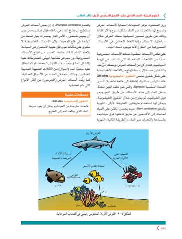 العلوم البيئية - الصف الحادي عشر - الفصل الدراسي األول: كتاب الطالب136ورق الصنفرة. توفر السنينات الحماية ألسماك القرش وتسمح لها بالتحرك عبر الماء بشكل أسرع وأكثر كفاءة وذلك عن طريق تحسين انسيابية سمك القرش خالل سباحتها. ال يمكن رؤية الخط الجانبي في األسماك الغضروفية من الخارج ألنه موجود تحت الجلد.على عكس األسماك العظمية، تمتلك األسماك الغضروفيةً عددا من الفتحات المنفصلة التي تساعد في تهويةَ الخياشيم. فلدى كل من أسماك القرش، وسمك الوْرنك، والشفنين خمسة إلى سبعة أزواج من الفتحات الخيشومية على شكل شقوق تسمى الشقوق الخيشومية slits Gillّ خلف الرأس مباشرة، إضافة إلى فتحة متحورة، تُسمى ّ الفتحة التنفسية Spiracle ، ً والتي تقع خلف العين تماما. يدخل الماء إلى هذه األسماك عن طريق الفم، ويمر فوق الخياشيم، ثم يخرج من خالل الشقوق الخيشومية. ويمكن لها استخدام طريقتين: الطريقة األولى »التهوية بالدفع ventilation Ram »حيث يحصل الكائن على المياه لحاجته إلى األكسجين عن طريق تدفقها فوق خياشيمه بالسباحة والتحرك عبر الماء. والطريقة الثانية »التهوية بالضخ ventilation Pumped »إذ إن بعض أسماك القرش يستطيع أن يضخ الماء في داخله فوق خياشيمه من دون أن يسبح باستمرار، األمر الذي يسمح له بنيل قسط من الراحة في قاع المحيط. وألن األسماك الغضروفية ال تحتوي على مثانات عوم، فإن عليها االستمرار في السباحة باتجاه األمام للبقاء عائمة. للعديد من أنواع األسماك الغضروفية دور مهم في نظامها البيئي، كمفترسات عليا ُ ّعد سمك القرش المجفف أو كما يطلق )الشكل 4-9 .)ويً عليه محليا اسم )العوال( من األكالت الشعبية المحببة للعمانيين، وينتشر بيعه في العديد من األسواق العمانية. كما وتُ ّعد أسماك القرش )الجرجور( من أكثر األنواع التي يتم تجفيفها.مصطلحات علميةالشقوق الخيشومية slits Gill:فتحات خارجية من الخياشيم يمكن أن يعود عبرها الماء الذي يبتلعه الفم إلى الخارج.الشكل ٤-9 القرش األزرق كمفترس رئيسي في الشعاب المرجانية.أسماك التانج األصفرالقرش األزرقالسيطرة على األنواع الغازية يستهلك األفراد المريضة والضعيفة هامورافتراسالسمكة األسديرعىطحالب مرجان