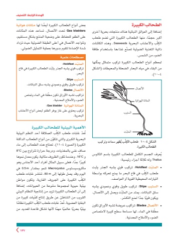 الوحدة الرابعة: التصنيف137الطـحالب الكبيرةإضافة إلى العوالق النباتية هناك منتجات بحرية أخرى ً أكبر حجما، منها الطحالب الكبيرة التي تضم طحلب ْب واألعشاب البحرية Seaweeds .وهذه الكائنات ِ الكلّ ذاتية التغذية الضوئية تصنع غذاءها باستخدام طاقة الضوء من الشمس.ّ لمعظم أنواع الطحالب الكبيرة تركيب متماثل يمكنها من البقاء في مياه البحار الضحلة والمحيطات )الشكل .)10-٤ُظهر سمات وتركيب ْلب يِالشكل ٤-10 طحلب الكالطحالب الكبيرة. األنصالالمثانة الهوائيةالستيبّتالمثبُعرف الجسم الكامل للطحالب الكبيرة باسم الثالوس يThallus وله ثالثة أجزاء رئيسية:● ّ المثبت Holdfast :تركيب قوي يشبه الجذر يثبت ْب في قاع البحر ما يمنع تحركه بواسطة طحلب ِ الكلالتيارات المحيطية القوية أو العواصف. ● الستيب Stipe :تركيب طويل وقوي وعمودي يشبه ّت ويصل إلى األنصال. ساق النباتات. يمتد من المثبً ويكون قوي ً ا جد ّ ا لمنع التكسر.● األنصال Blades :تراكيب عريضة تشبه األوراق تكون ّقة في الماء. لها مساحة سطح كبيرة المتصاص معلالضوء واألمالح المعدنية.ً بعض أنواع الطحالب الكبيرة أيضا لها مثانات هوائيةbladders Gas تحت األنصال. تساعد هذه المثانات ٍ على الطفو للحفاظ على وضعية المنتج بشكل مستقيم، وتتواجد األنصال في أعلى الطبقة الضوئية حيث تزداد شدة اإلضاءة لتقوم بدورها بعملية التمثيل الضوئي. مصطلحات علميةّ المثبت Holdfast:ّت الطحالب الكبيرة في قاع تركيب قوي يشبه الجذر يثبالبحر.الستيب Stipe:تركيب طويل وقوي وعمودي يشبه ساق النباتات.األنصال Blades:ّقة في الماء وتمتص تراكيب تشبه األوراق تكون معلالضوء واألمالح المعدنية.المثانة الهوائية bladder Gas:تركيب يحتوي على غاز يوفر الطفو لبعض أنواع األعشابالبحرية.األهمية البيئية للطحالب الكبيرةْب العمالقة أحد النظم البيئية تُ ّعد ِ غابات طحلب الكلّ البحرية الكبرى والتي تتكون من أنواع الطحالب الداكنة الكبيرة )الصورة ٤-١١ .)تحتاج هذه الطحالب إلى ماء ٍصاف غني بالمغذيات، ودرجة حرارة تتراوح بين C°8و C°16 .وعندما تكون الظروف مثالية، يكون معدل نموها ً كبير ً ا جدا، فعلى سبيل المثال أفراد أحد األجناس وهو ماكروسيستوس Macrocystus تنمو بمقدار m 5.0 في اليوم وقد يصل طولها إلى m 80 .تنتشر غابات طحلب ْب الكبيرة على الجروف القارية، وتكون مواطن ِ الكلبيئية حيوية لمجموعة متنوعة من الحيوانات، إضافة إلى أن الطحالب الكبيرة تزيد من إنتاجية النظام البيئي ّ القريب من الشاطئ عن طريق إنتاج كميات كبيرة من ْ ً ب الكبيرة نظاما البقايا العضوية. تُ ّعد ِ غابات طحلب الكلً بيئي ً ا بحري ً ا عالمي ً ا مهما ألنها تشكل قاعدة للعديد من
