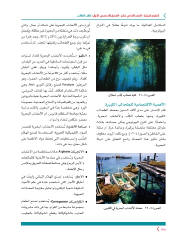 العلوم البيئية - الصف الحادي عشر - الفصل الدراسي األول: كتاب الطالب138ً السالسل الغذائية، ما يولد تنوعا هائًل في األنواع البيولوجية.ْلب عمالق.ِالصورة ٤-١١ غابة طحلب كاألهمية االقتصادية للطحالب الكبيرةقام اإلنسان على مدى آالف السنين بحصاد الطحالب ْب واألعشاب البحرية. ِ الكبيرة، ومنها طحلب الكلً واعتمادا على النوع البيولوجي يمكن حصادها بثالث طرائق مختلفة: ملتصقة بركيزة، وعائمة حرة، أو ملقاة على الشاطئ )الصورة ٤-١٢ .)ومع ذلك، أثيرت مخاوف بشأن تأثير هذا الحصاد واسع النطاق على البيئة البحرية.الصورة ٤-١٢ حصاد األعشاب البحرية في الفلبين.تُزرع بذور األعشاب البحرية على شباك أو حبال، والتي ُفضل تُربط بعد ذلك في منطقة من البحيرة غير مظللة، ويأن تكون درجة الحرارة بين C°25 و C°30 .وبعد فترة من ّ نموها، يتم جمع الطحالب وتعليقها لتجف. ثم تُستخدم في ما يلي:● الطهو: استُ ِخدمت األعشاب البحرية كغذاء لسنوات ِ من قبل المجتمعات الساحلية في العديد من البلدان، مثل اليابان، وكوريا، وأيسلندا وويلز. ففي اليابان ُستخدم أكثر من 20 ً نوعا من األعشاب البحرية مثًل، يكغذاء، ويتم تجفيف نوع من الطحالب الحمراء وهو البورفيرا Porphyra لصنع رقائق النوري Nori ،وهي شائعة االستخدام كغالف تُ ّ لف بها لفائف السوشي. من الناحية الغذائية، األعشاب البحرية غنية بالبروتين ً وبالعديد من الفيتامينات واألمالح المعدنية، خصوصا ً اليود، وهي منخفضة جد ّ ا في الدهون. وأكدت دراسة بحثية بجامعة السلطان قابوس، أن األعشاب البحرية مصدر متكامل للغذاء والدواء.● صناعة األغذية: تُستخدم األعشاب البحرية كمصدر للمواد الكيميائية الحيوية المستخدمة لصنع الهالم ُّ الصلب والمستحلبات التي تحفظ مواد األطعمة على ّق، بما في ذلك:شكل معل○ األلجينات Alginate :مادة مستخلصة من األعشاب البحرية وتُستخدم في صناعة األغذية كالمثلجات )اآليس كريم(، وفي صناعة لصقات الحروق ومالبس رجال اإلطفاء.ُ ً ستخدم لصنع الهالم النباتي وأيضا في ○ األجار: يأطباق األجار التي تُستخدم عادة في علم األحياء الدقيقة لتنمية البكتيريا واختبار مقاومة المضادات الحيوية.ُستخدم لصنع الطعام ○ الكاراجينان Carrageenan :يبمجموعة متنوعة من القوام، بما في ذلك مشروباتالحليب بالشوكوالتة وقطع الشوكوالتة بالحليب،