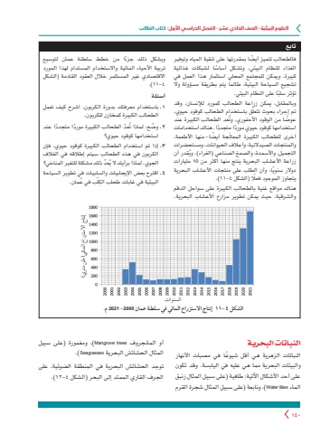 العلوم البيئية - الصف الحادي عشر - الفصل الدراسي األول: كتاب الطالب140النباتات البحريةً النباتات الزهرية هي أقل شيوعا في مصبات األنهار والبيئات البحرية مما هي عليه في اليابسة. وقد تكون على أحد األشكال اآلتية: طافية )على سبيل المثال زنبق الماء lilies Water ،)ونابعة )على سبيل المثال شجرة القرم أو المانجروف trees Mangrove ،)ومغمورة )على سبيل المثال الحشائش البحرية Seagrasses.)توجد الحشائش البحرية في المنطقة الضوئية، على الجرف القاري الممتد إلى البحر )الشكل 4-12.)تابعً فالطحالب تتميز أيضا بمقدرتها على تنقية المياه وتوفير ً الغذاء للنظام البيئي، وتشكل أساسا لشبكات غذائية كبيرة. ويمكن للمجتمع المحلي استثمار هذا العمل في تشجيع السياحة البيئية، طالما يتم بطريقة مسؤولة وال ً تؤثر سلبا على النظام البيئي. وبالمقابل، يمكن زراعة الطحالب كمورد لإلنسان، وقد ّق باستخدام الطحالب كوقود حيوي، تم إجراء بحوث تتعلً عوضا من الوقود األحفوري، وتُعد الطحالب الكبيرة عند ً استخدامها كوقود حيوي مورد ً ا متجددا. هناك استخدامات َ ً جة أيضا-منها األطعمة، أخرى للطحالب الكبيرة المعالوالمنتجات الصيدالنية، وأعالف الحيوانات، ومستحضرات ُقدر أن التجميل، واألسمدة، والصمغ الصناعي )الغراء(. ويزراعة األعشاب البحرية ينتج منها أكثر من 10 مليارات ً دوالر سنويا، وأن الطلب على منتجات األعشاب البحرية يتجاوز الموجود فعًل )الشكل ٤-11 .)هناك مواقع غنية بالطحالب الكبيرة على سواحل الدقم والشرقية، حيث يمكن تطوير مزارع األعشاب البحرية. ً ويشكل ذلك جزءا من خطط سلطنة عمان لتوسيع تربية األحياء المائية واالستخدام المستدام لهذا المورد االقتصادي غير المستثمر خالل العقود القادمة )الشكل .)11-4أسئلة ١ .باستخدام معرفتك بدورة الكربون، اشرح كيف تعمل الطحالب الكبيرة كمخازن للكربون.٢ ّ .وضح: لماذا تُ ّعد ً الطحالب الكبيرة مورد ً ا متجددا عند استخدامها كوقود حيوي؟٣ .إذا تم استخدام الطحالب الكبيرة كوقود حيوي، فإن الكربون في هذه الطحالب سيتم إطالقه في الغالف ُ ّعد ذلك مشكلة للتغير المناخي؟الجوي. لماذا برأيك ال ي٤ .اقترح بعض اإليجابيات والسلبيات في تطوير السياحة ْ ُ ب في عمان.ِ البيئية في غابات طحلب الكلالشكل ٤-11 إنتاج االستزراع المائي في سلطنة عمان 2000 - 2021 م.السنواتإنتاج االستزراع المائي)طن متري(