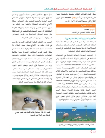 العلوم البيئية - الصف الحادي عشر - الفصل الدراسي األول: كتاب الطالب142ً يمكن لهذه النباتات التكاثر جنسي ً ا والجنسي ً ا أيضا. ففي التكاثر الجنسي، تُنتج ً أزهارا Flowers تطلق حبوب اللقاح التي يحملها الماء إلى أزهار أخرى.مصطلحات علميةالزهرة Flower:عضو التكاثر الجنسي في النبات.األهمية البيئية للنباتات البحريةالنباتات البحرية هي أساس المجتمعات األحيائية المائية ذات التنوع البيولوجي الواسع. تجعلها حساسيتها ً لجودة المياه أنواعا أساسية مهمة قد تساعد في تحديد الصحة العامة للنظم البيئية الساحلية. إن النباتات البحرية والعوالق النباتية هي المنتجات السائدة في المواطن البيئية لمصبات األنهار، وهي مصدر غذاء مباشر للمستهلكات األولية البحرية. تمثل حشائش السلحفاة testudinum Thalassia ،الموجودة ً في خليج المكسيك والبحر الكاريبي وبرمودا مصدرا ً غذائي ً ا حيويا للسالحف وخراف البحر واألسماك آكالت األعشاب )الشكل 4-4 ّ 1 .)وفي شبه جزيرة بر الحكمان في والية محوت، يتوافر نوعان من الحشائش البحرية هما حشائش البحر ضيقة األوراق uninervis Haloduleُ ّعد كالهما ومحب الملح البيضاوي ovalis Halophila ،ويً غذاء ً أساسيا للسالحف الخضراء. وتوفر بقايا حشائش البحر الميتة طاقة عضوية للديدان وخيار البحر والسرطانات وشوكيات الجلد وشقائق النعمان البحرية، كما توفر حشائش البحر طوال العام لبعض أنواع ً األسماك موطن ً ا بيئيا لتعشيش وحضانة أنواع أخرى.الشكل ٤-14 األهمية البيئية لمروج الحشائش البحرية.سلحفاةخروف البحرسمكبحرحشائش بحريةسماءCO2تمثل مروج حشائش البحر مصبات كربون ومصادر أكسجين تعزز بيئة بحرية صحية. فأوراق حشائش البحر الطويلة والرفيعة تساعد على امتصاص حركة األمواج والتيارات البطيئة، والتقليل من التعكر عن طريق احتجاز الطمي. وتربط أنظمة جذورها الكثيفة المتشابكة الرواسب الناعمة، كما تساعد في المحافظة على جودة المناطق الساحلية عن طريق امتصاص الجريان السطحي من نظم اليابسة البيئية. العديد من النظم البيئية للنباتات البحرية يتواجدفي توازن دقيق بين األنواع. فعلى سبيل المثال، إذا انخفضت أعداد الجماعة األحيائية لسالحف البحر بشكل كبير، تموت الحشائش البحرية ويحل مكانها الطحالب. ولمكافحة ذلك، يمكن للقائمين بالحفاظ على البيئة استخدام فقاسات السالحف لزيادة أعداد سالحف البحر المحلية )الصورة 4-14 ،)األمر الذي ّ يزيد من خصوبة قاع البحر ويحفز النمو الجيد لحشائش البحر، كما تساعد على نشر هذه الحشائش. ً ومع ذلك، إذا أصبحت أعداد السالحف كبيرة جدا، ٍ فسيتم استهالك حشائش البحر بشكل مفرط وتموت. وقد يحدث هذا في المناطق التي تنخفض فيها أعداد أسماك القرش المفترسة بسبب الصيد الجائر. الصورة 4-14 استخدام فقاسة السالحف ضمن مشروع الحفاظ على السالحف البحرية.