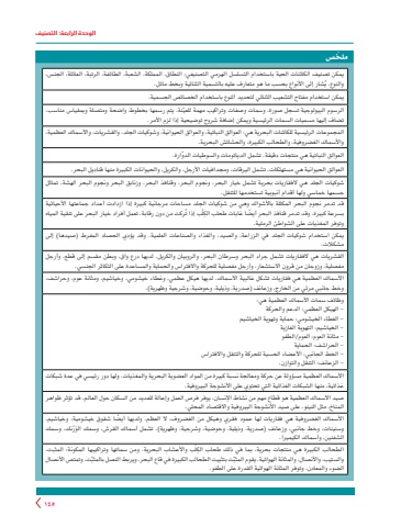 الوحدة الرابعة: التصنيف145ّ ملخصيمكن تصنيف الكائنات الحية باستخدام التسلسل الهرمي التصنيفي: النطاق، المملكة، الشعبة، الطائفة، الرتبة، العائلة، الجنس، ُشار إلى األنواع بحسب ما هو متعارف عليه بالتسمية الثنائية وبخط مائل.والنوع. ييمكن استخدام مفتاح التشعيب الثنائي لتحديد النوع باستخدام الخصائص الجسمية.ّ الرسوم البيولوجية تسجل صورة، وسمات وصفات وتراكيب مهمة للعينة. يتم رسمها بخطوط واضحة ومتصلة وبمقياس مناسب. تضاف إليها مسميات السمات الرئيسية ويمكن إضافة شروح توضيحية إذا لزم األمر.المجموعات الرئيسية للكائنات البحرية هي: العوالق النباتية، والعوالق الحيوانية، وشوكيات الجلد، والقشريات، واألسماك العظمية، واألسماك الغضروفية، والطحالب الكبيرة، والحشائش البحرية.ّ العوالق النباتية هي منتجات دقيقة. تشمل الدياتومات والسوطيات الدوارة.العوالق الحيوانية هي مستهلكات. تشمل اليرقات، ومجدافيات األرجل، والكريل، والحيوانات الكبيرة منها قناديل البحر.شوكيات الجلد هي الفقاريات بحرية تشمل خيار البحر، ونجوم البحر، وقنافذ البحر، وزنابق البحر ونجوم البحر الهشة. تماثل جسمها خماسي ولها أقدام أنبوبية تستخدمها للتنقل.قد تدمر نجوم البحر المكللة باألشواك وهي من شوكيات الجلد مساحات مرجانية كبيرة إذا ازدادت أعداد جماعتها األحيائية ْب إذا تُركت من دون رقابة. تعمل أفراد خيار البحر على تنقية المياه ً بسرعة كبيرة. وقد تدمر قنافذ البحر أيض ِ ا غابات طحلب الكلوتوفر المغذيات على الشواطئ الرملية.يمكن استخدام شوكيات الجلد في الزراعة، والصيد، والغذاء والصناعات العلمية. وقد يؤدي الحصاد المفرط )صيدها( إلى مشكالت. القشريات هي الفقاريات تشمل جراد البحر وسرطان البحر، والروبيان والكريل. لديها درع واق، وبطن مقسم إلى قطع، وأرجل مفصلية، وزوجان من قرون االستشعار، وأرجل مفصلية للحركة واالفتراس والحماية والمساعدة على التكاثر الجنسي.األسماك العظمية هي فقاريات تشكل غالبية األسماك. لديها هيكل عظمي، وغطاء خيشومي، وخياشيم، ومثانة عوم، وحراشف، وخط جانبي مرئي من الخارج، وزعانف )صدرية، وذيلية، وحوضية، وشرجية وظهرية(.وظائف سمات األسماك العظمية هي:- الهيكل العظمي: الدعم والحركة- الغطاء الخيشومي: حماية وتهوية الخياشيم- الخياشيم: التهوية الغازية- مثانة العوم: العوم/الطفو- الحراشف: الحماية- الخط الجانبي: األعضاء الحسية للحركة والتنقل واالفتراس- الزعانف: التنقل والتوازن.األسماك العظمية مسؤولة عن حركة ومعالجة نسبة كبيرة من المواد العضوية البحرية والمغذيات. ولها دور رئيسي في عدة شبكات غذائية، منها الشبكات الغذائية التي تحتوي على األنشوجة البيروفية.صيد األسماك العظمية هو قطاع مهم من نشاط اإلنسان، يوفر فرص العمل وإعالة للعديد من السكان حول العالم. قد تؤثر ظواهر المناخ، مثل النينو، على صيد األنشوجة البيروفية واالقتصاد المحلي.ً األسماك الغضروفية هي فقاريات لها عمود فقري وهيكل من الغضروف، ال العظم. ولديها أيضا شقوق خيشومية، وخياشيم، َ وسنينات، وخط جانبي، وزعانف )صدرية، وذيلية، وحوضية، وشرجية، وظهرية(. تشمل أسماك القرش، وسمك الوْرنك، وسمك الشفنين، وأسماك الكيميرا.ْب واألعشاب البحرية. ومن سماتها وتراكيبها المكونة: المثبت، ِ الطحالب الكبيرة هي منتجات بحرية، بما في ذلك طحلب الكلّت، وتمتص األنصال ّت بتثبيت الطحالب الكبيرة في قاع البحر، ويربط النصل بالمثبوالستيب، واألنصال، والمثانة الهوائية. يقوم المثبالضوء والمعادن، وتوفر المثانة الهوائية القدرة على الطفو.