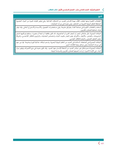 العلوم البيئية - الصف الحادي عشر - الفصل الدراسي األول: كتاب الطالب146تابعْ ّ ب مهمة كأساس للعديد من الشبكات الغذائية، وفي توفير كميات كبيرة من المواد العضوية ِ الطحالب الكبيرة ومنها طحلب الكلّ المتحللة للنظم البيئية القريبة من الشاطئ. وهي مفيدة في دورات المغذيات. تُستخدم الطحالب الكبيرة في صناعة الغذاء بطرائق متنوعة، وفي مستحضرات التجميل، واألسمدة واالستزراع المائي. وقد توفر فوائد إضافية كمخازن للكربون.النباتات البحرية، مثل حشائش البحر أو أشجار القرم أو المانجروف، قد تكون طافية، أو نابعة أو مغمورة. سماتها وتراكيبها تشمل الرايزومات، والجذور، واألزهار، واألوراق. يقوم الجذر بتثبيت النبات وامتصاص المغذيات، والرايزوم للتكاثر الالجنسي، والورقة عضو التمثيل الضوئي، والزهرة للتكاثر الجنسي.النباتات البحرية هي المنتجات السائدة في العديد من النظم البيئية البحرية، وتدعم شبكات غذائية كبيرة ومتنوعة. لها دور مهم ّ في دورات المغذيات وهي مواطن بيئية لكائنات أخرى.النباتات البحرية تدعم بشكل غير مباشر العديد من أنشطة اإلنسان منها الصيد. وقد تكون مفيدة في منع االنجراف وتوفير مواد البناء. في اآلونة األخيرة، ازدادت أهميتها كمخازن للكربون وللسياحة البيئية.