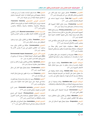 العلوم البيئية - الصف الحادي عشر - الفصل الدراسي األول: كتاب الطالب 156االفتراس Predation :تفاعل حيوي حيث يقوم كائن حي )المفترس( بقتل وأكل كائن حي آخر )فريسته(. )ص ٢٦)األقدام األنبوبية feet Tube :نتوءات أنبوبية تساعد في ّ الحركة والتغذية والتنفس. )ص ١٣٠)اإلنتاجية Productivity :معدل إنتاج الكتلة الحيوية لكل وحدة مساحة أو حجم لكل وحدة زمنية. )ص ٩٢)اإلنتاجية األولية productivity Primary :معدل إنتاج الكتلة الحيوية الجديدة في نظام بيئي ما لكل وحدة مساحة أو حجم خال ّ ل فترة زمنية معينة، والتي تنتجها الكائنات الحية ذاتية التغذية. )ص ٩٢)ّقة في الماء األنصال Blades :تراكيب تشبه األوراق تكون معلوتمتص الضوء واألمالح المعدنية. )ص ١٣٧)البحار Seas : ً مسطحات مائية أصغر وأقل عمقا من ً المحيطات، محاطة جزئيا باليابسة؛ وتكون حيث يلتقي المحيط باليابسة. )ص ١٢١)البيانات Data :مجموعة من المعلومات، على شكل حقائق، أو أعداد، أو قياسات، أو إحصائيات، يمكن استخدامها للتحليل. )ص 51)ّ البيانات الكمية data Quantitative : ّ بيانات عددية، تبين ّ الكمي ّ ة، والمدى أو مقدار متغي ّ ر ما. على سبيل المثال، كمية األمطار الشهرية. )ص 51)بيانات موثوقة data Reliable :بيانات كاملة ودقيقة إلى ّحد معقول، تعمل على اإلجابة عن الفرضية بطريقة واضحة ٍ وشفافة ولم يتم التدخل فيها أو تعديلها بشكل غير مناسب.)ص ٥٧)البيانات النوعية data Qualitative :بيانات وصفية، أو غير عددية. يتم جمع هذه البيانات من خالل المالحظات، والمقابالت، ومجموعات التركيز. )ص 51)*البيئة Environment :الوسط المحيط الذي يعيش فيه الكائن الحي. )ص٢٠)التبادل Mutualism :عالقة بين كائنَ َّ ين حي َ ين مختلفين حيث يستفيد كال الكائنَ َّ ين الحيين. )ص 88)التبخر Evaporation : ّ عملية يتحول فيها السائل إلى غاز. )ص ٢٢)ّ التحيز Bias :عندما يقوم الباحث، بقصد أو من دون قصد، ّ بأخطاء منهجية في جمع العينات أو اختبار الفرضية، باختيار ّ أو تفضيل نتيجة معينة من دون غيرها. )ص ٥٢)التسلسل الهرمي التصنيفي hierarchy Taxonomic :تصنيف نوع من أنواع الكائنات الحية عن طريق وصف النطاق، والمملكة، والشعبة، والطائفة، والرتبة، والعائلة، والجنس، والنوع. )ص ١٢١)التسمية الثنائية nomenclature Binomial :االسم الالتيني َين: الجنس والنوع. ّ لكل نوع من الكائنات الحية، يتكون من جزأ)ص ١٢١)التطفل Parasitism :عالقة بين كائنَ َّ ين حيين حيث يستفيد المتطفل على حساب العائل. )ص 88)التعايش Commensalism :عالقة بين كائنَ َّ ين حيين حيث يستفيد أحد الكائنَ َّ ين الحيين في حين ال يتضرر اآلخر وال يستفيد. )ص 88)تقييم األثر البيئي Assessment Impact Environmental)EIA :)تقييم العواقب البيئية لخطة، أو سياسة، أو برنامج، أو مشروع قبل اتخاذ قرار العمل به. )ص ٥٠)التكافل Symbiosis :عالقة بين كائنَ َّ ين حيين أو أكثر من أنواع ً مختلفة تعيش متقاربة جسميا. )ص 88)التكثف Condensation : ّ عملية يتحول فيها الغاز إلى سائل نتيجة التبريد. )ص ٢٣)التكرار Frequency ّ :عدد مرات ظهور نوع معين )مثل النبات ّ في عينة ما(. )ص ٦٢)*التلوث Pollution :وجود أو إدخال مادة ضارة أو لها تأثيرات ّ سامة في البيئة. على سبيل المثل الماء الملوث ضار وغير صالح للشرب. )ص ٢١)التماثل الخماسي symmetry Pentaradial :خمس أذرع ّ تتفرع من تجويف مركزي للجسم. )ص ١٢٩)التمثيل الضوئي Photosynthesis :العملية التي تصنع النباتات من خاللها الجلوكوز باستخدام ثاني أكسيد الكربون والماء والطاقة من أشعة الشمس. )ص ٣٣)التمثيل الغذائي Assimilation : ّ تحول ّ المغذي إلى شكل قابل لالستخدام يمكن دمجه في أنسجة الكائن الحي. )ص ١٠٢)