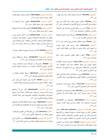 العلوم البيئية - الصف الحادي عشر - الفصل الدراسي األول: كتاب الطالب 158*الرطوبة Humidity :النسبة المئوية لبخار الماء في الهواء. )ص ٢٣)الرعي Grazing :تفاعل حيوي يتغذى فيه كائن حي على النباتات مثل األعشاب أو أوراق األشجار أو الطحالب. )ص ٢٦)الزعانف Fins :تبرز من سطح الجسم وتساعد في الحركة، والتوازن، والتكاثر، والحماية. )ص ١٣٣)*زمن البقاء time Residence :متوسط الزمن الذي يستغرقه بقاء جسيم في نظام ما. )ص ١٠٤)الزهرة Flower :عضو التكاثر الجنسي في النبات. )ص ١٤٢)* ُّ السبات Hibernation :فترة زمنية يكون فيها النبات أو الحيوان في حالة سكون أو حالة غير نشطة تشبه النوم.)ص ٣١)الستيب Stipe :تركيب طويل وقوي وعمودي يشبه ساق النباتات. )ص ١٣٧)السلسلة الغذائية chain Food :تسلسل تغذية الكائنات الحية، ويشير إلى تدفق الطاقة، حيث يتم استهالك أحد األنواع من المستهلك الذي يليه، أي من المنتج عبر السلسلة إلى المفترس العلوي. )ص ٢٧)السنينات Denticles :نوع من الحراشف المتداخلة التي توفر الحماية وتحسن الكفاءة الهيدروديناميكية في أسماك القرش. )ص 135)الشبكة الغذائية web Food :ارتباط جميع أفراد السالسل الغذائية داخل المجتمع األحيائي. )ص ٢٨)الشقوق الخيشومية slits Gill :فتحات خارجية من الخياشيم يمكن أن يعود عبرها الماء الذي يبتلعه الفم إلى الخارج. )ص ١٣٦)شوكيات الجلد Echinoderms :مجموعة من الالفقاريات البحرية أجسامها ذات تماثل خماسي ولها أقدام أنبوبية. )ص ١٢٥)صافي االنبعاثات الصفري emissions zero Net :هدف التخلص التام من كمية الغازات الدفيئة الناتجة من األنشطة البشرية وذلك عن طريق تخفيض االنبعاثات وتنفيذ طرائق المتصاص ثاني أكسيد الكربون من الغالف الجوي. )ص ٣٥)*طبقة المياه الجوفية Aquifer :طبقة منفذة من الصخور تحت سطح األرض تخزن الماء في مسام الصخر. )ص ٢٣)الطحالب الكبيرة Macroalgae :منتجات بحرية، منها طحلب ْب وعشب البحر. )ص ١٢٥)ِ الكل*طفيل خارجي Ectoparasite :طفيلي مثل البرغوث أو القملة يعيش على سطح العائل. )ص ٨٩)*طفيل داخلي Endoparasites :طفيلي مثل الدودة الشريطية يعيش داخل جسم العائل. )ص ٨٩)العامل المحدد factor Limiting :هو العامل الذي يسبب تباطؤ نمو الجماعة األحيائية أو تقييد حجمها )قد يستخدم ً مصطلح العامل المحدد أيضا في سياقات أخرى لإلشارة إلى أي عامل يمكن أن يبطئ أو يقلل من احتمال حدوث أمر ما(. )ص ٢٨)العوالـق Plankton ّ :كائنــات بحريــة مجهريــة تطفــو بحريــة.)ص ١٢٥)العوالق الحيوانية Zooplankton :عوالق مستهلكة، وهي حيوانات إما أن تطفو أو تسبح ببطء. )ص ١٢٥)ّعينة Sample :مجموعة من البيانات )عدد النباتات، وعدد ُ األنواع، وتوزيع النباتات( جمعت من جماعة أحيائية كبيرة لقياسها. )ص 54)الغطاء الخيشومي Operculum :سديلة عظمية رقيقة من الجلد تغطي الخياشيم وتحميها. )ص ١٣٣)غير الحيوية Abiotic :األشياء غير الحية التي تؤثر على تركيب النظام البيئي مثل المناخ ونوع التربة وزاوية االنحدار. )ص ٢٥)غير ذاتي التغذية Heterotrophic :كائن حي ال يستطيع صنع غذائه بنفسه، بل يتغذى على كائنات حية أخرى. جميع الحيوانات والفطريات واألوليات الحيوانية غير ذاتية التغذية، وكذلك معظم البكتيريا. )ص 91)ُصيغها الفرضية Hypothesis : ّ عبارة محددة قابلة لالختبار يالباحث ويتنبأ بها نتيجة دراسة تم التخطيط لها لإلجابة عن سؤال محدد. )ص ٥١)*القارت Omnivore ً :كائن حي يأكل كل من اللحوم والنباتات، ً ويؤدي غالبا دور المستهلك الثانوي. )ص ٢٨)*القدرة االستيعابية capacity Carrying :عدد األنواع التي ّ يمكن أن تستوعبها منطقة معينة دون تدهور البيئة. )ص٢٠)