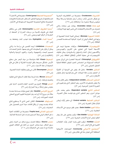 المصطلحات العلمية159القشريات Crustaceans :مجموعة من الالفقاريات البحرية ُ مع هيكل خارجي صلب، وعشر أرجل مفصلية ومرحلة يرقة ً نوبليوس )يرقة صغيرة جدا وشفافة(. )ص ١٢٥)قيم شاذة values Anomalies :بيانات غير معتادة، والتي تنحرف عن األنماط واالتجاهات التي تشير إليها بقية البيانات. )ص ٥٥)الكتلة الحيوية Biomass :إجمالي كمية المادة العضوية أو وزنها في النظام البيئي أو المواد النباتية المستخدمة كمصدر للطاقة. )ص ٢٨)الكربوهيدرات Carbohydrate :مركبات عضوية توجد فياألنسجة الحية التي تحتوي على الكربون والهيدروجين واألكسجين )مثل، النشا والسليلوز والسكريات(. يمكن تفكيك ّ الكربوهيدرات في عملية التنفس إلطالق الطاقة. )ص ٨٧)الكلوروفيل Chlorophyll :الصبغة الخضراء في أوراق جميع النباتات المسؤولة عن امتصاص الضوء لتوفير الطاقة لعملية التمثيل الضوئي. )ص ٣٣)ّ المتغير Variable : ّ عامل قد يتغير في النوعية أو الكمية أو الحجم بحسب فئة البيانات التي يتم قياسها )مثل هطول األمطار(. )ص ٥٣)ّ المتغير المستقل variable Independent :متغير قائم بذاته ّ وال يتغي ّ ر بالمتغيرات األخرى. وهو المتغير الذي يتم تغييره في التجربة الختبار الفرضية. )ص ٥٣)ّ المتغير التابع variable Dependent :متغير يعتمد على عوامل أخرى، وهو المتغير الذي يتم قياسه خالل التجربة. )ص ٥٣)ّت )يبقى ُثبّ المتغير الضابط variable Control :أي متغير يً ثابتا( خالل التجربة. )ص ٥٥)مثانة العوم bladder Swim :عضو طفو موجود في األسماك العظمية. )ص ١٣٤)المثانة الهوائية bladder Gas :تركيب يحتوي على غاز يوفر الطفو لبعض أنواع األعشاب البحرية. )ص ١٣٧)ّت الطحالب ّ المثبت Holdfast :تركيب قوي يشبه الجذر يثبالكبيرة في قاع البحر. )ص ١٣٧)*المجتمع األحيائي Community :الجماعات األحيائية ً المختلفة التي تعيش معا في نظام بيئي. )ص ٢٥)*المجموعة الضابطة group Control :مجموعة في االختبار ال تتم معالجتها أو تعريضها للمتغير المستقل. تتم مقارنة نتائج هذه المجموعة بنتائج المجموعة التجريبية المستهدفة في االختبار. )ص ٥٢)*محبة للظروف القاسية Extremophile :كائن حي متأقلم للبقاء في ظروف قاسية من درجات الحرارة أو الضغط أو الملوحة أو الرقم الهيدروجيني. )ص ٩٤)*محبة للماء Hydrophilic :مادة تجذب الماء وتحتفظ به. )ص ٣٠)المحددات Limitations :أوجه القصور في دراسة ما، والتييمكن أن تؤثر على المعلومات التي يتم جمعها. تشمل المحددات تصميم البحث، والمنهجية، والمواد، والقيود الزمنية والمالية )التكاليف(. )ص ٥٧)المحيط Ocean :كتلة متواصلة من مياه البحر على سطح ّ األرض، تتشك ّ ل حدودها بكتل اليابسة القارية أو تالل في قاع المحيط أو خط االستواء. )ص ١٢١)المحلل Decomposer:كائن حي يقوم بتفكيك المادة العضوية. )ص ٢٨ )*المخاط Mucus :مادة لزجة دبقة تغلف السطح الذي تغطيه وتحميه وترطبه. )ص ٣١)المدى Range :الفرق بين الحدود العليا والحدود الدنيا على ّ مقياس معي ً ن )مثل درجة الحرارة(. )ص 39)المربع القياسي Quadrat : ّ إطار لجمع عينات بمساحة محددة m2 1 )واحد يتم اختيارها لتقييم التوزيع المحلي مث ًال متر مربع )للنبات الحيوانات. )ص ٥٩)المستهلك Consumer :الكائن الحي الذي ال يستطيع إنتاج غذائه بنفسه ويجب أن يأكل كائنات حية أخرى للحصول على المغذيات. )ص ٢٨)المستوى الغذائي level Trophic :مجموعة من الكائنات الحيةداخل النظام البيئي تمأل المستوى نفسه داخل السلسلة الغذائية. )ص ٢٧)مصدر Source : ٍ منطقة تتصف بربح صاف من المواد )على سبيل المثال، حيث ينتشر المزيد من الغاز في الغالف الجويمقارنة مع ما يذوب في المحيط(. )ص ١٠٥)