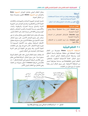 العلوم البيئية - الصف الحادي عشر - الفصل الدراسي األول: كتاب الطالب 241-3 النظم البيئية المنطقة األحيائية Biome مجموعة من النظم البيئية المختلفة في منطقة جغرافية واسعة النطاق تُحدد بواسطة المناخ والغطاء النباتي السائد، على سبيل المثال، الغابة االستوائية المطيرة. بالمقابل، النظام البيئي Ecosystem هو مساحة جغرافية أصغر من المنطقة األحيائية، على سبيل المثال أرض رطبة ّ صغيرة، أو نوع معين من الغابات.يتمثل النظام البيئي بتفاعل العوامل الحيوية Bioticوالعوامل غير الحيوية Abiotic ّ لتكوين مجموعة معينة من أشكال الحياة.تشـمل العوامـل الحيويـة النباتـات والحيوانـات والكائنـات الحيـة األخـرى كالبكتيريـا، وتشـمل العوامـل غيـر الحيويـة التربـة والمنـاخ، ودرجـة الحـرارة، والرطوبـة، والمـاء، واألكسـجين، ودرجـة الملوحـة، والضـوء المتوافـر، والرقـم الهيدروجينـي )pH )التـي بدورهـا تؤثـر على النظام البيئي. يعتمد كل عامل داخل النظام البيئي بشكل مباشر أو غير مباشر على جميع العوامل األخرى. على سبيل المثال، تعتمد األشجار في منطقة األمازون على مستويات هطول األمطار المرتفعة. ويتغير عدد األشجار الموجودة إذا تغيرت كمية األمطار، األمر الذي قد يؤثر على الكائنات الحية األخرى، وقد يؤدي في النهاية إلى تغير التربة نتيجة لتأثر المغذيات في النظام البيئي. قد يختلف حجم النظام البيئي، فقد تكون النظم البيئية ً صغيرة جدا؛ على سبيل المثال، البركة Pond هي نظام بيئي، كاألرض الرطبة الصغيرة في الغابة )الشكل ١-٤ .)فاألراضي الرطبة Wetland ال تكون معزولة عن الغابة، وهي تتفاعل مع النظام البيئي األكبر. ًا.ً ا بيئيالشكل 1-٤ الربكة والكائنات احلية التي تعيش فيها تشكل نظامجميع الكائنات الحية من النوع نفسه تشكل جماعة أحيائية.جميع األفراد التي ً تعيش معا في البركة ًّا.ً تشكل مجتمعا أحيائيالبركة هي موطن بيئي.أسئلة٣ ارسم وصف ً بإيجاز دورة الماء مضمنا المصطلحات العلمية الصحيحة وتسلسلها.٤ قارن بين نظام الماء المفتوح ونظام الماء المغلق.أفعال إجرائيةً ا تخطيطي ً ا بسيطا يوضح ارسم Sketch : ً أنشئ رسم ّالميزات الرئيسية.ِصف Describe : ّ قدم/اذكر الخصائص أو السمات والميزات الرئيسية.قارن Compare : ّ حدد أوجه التشابه و/ أو االختالف ّ ًقا عليها. معل