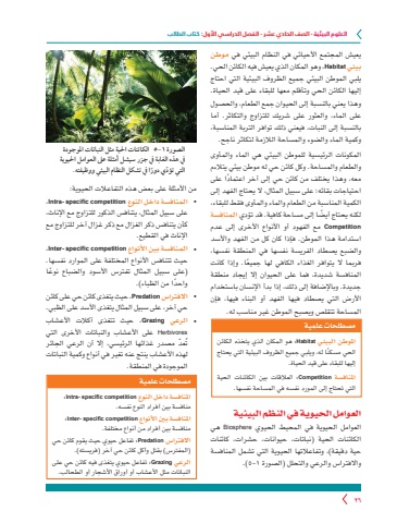 العلوم البيئية - الصف الحادي عشر - الفصل الدراسي األول: كتاب الطالب 26يعيش المجتمع األحيائي في النظام البيئي في موطن بيئي Habitat ،وهو المكان الذي يعيش فيه الكائن الحي. يلبي الموطن البيئي جميع الظروف البيئية التي احتاج إليها الكائن الحي وتأقلم معها للبقاء على قيد الحياة. وهذا يعني بالنسبة إلى الحيوان جمع الطعام، والحصول على الماء، والعثور على شريك للتزاوج والتكاثر. أما بالنسبة إلى النبات، فيعني ذلك توافر التربة المناسبة، وكمية الماء والضوء والمساحة الالزمة لتكاثر ناجح.المكونات الرئيسية للموطن البيئي هي الماء والمأوى والطعام والمساحة. وكل كائن حي له موطن بيئي يتالءم ً معه، وهذا يختلف من كائن حي إلى آخر اعتمادا على احتياجات بقائه؛ على سبيل المثال، ال يحتاج الفهد إلى الكمية المناسبة من الطعام والماء والمأوى فقط للبقاء، ً لكنه يحتاج أيضا إلى مساحة كافية. قد تؤدي المنافسةCompetition مع الفهود أو األنواع األخرى إلى عدم استدامة هذا الموطن. فإذا كان كل من الفهد واألسد والضبع يصطاد الفريسة نفسها في المنطقة نفسها، ً فربما ال يتوافر الغذاء الكافي لها جميعا. وإذا كانت المنافسة شديدة، فما على الحيوان إال إيجاد منطقة جديدة. وباإلضافة إلى ذلك، إذا بدأ اإلنسان باستخدام األرض التي يصطاد فيها الفهد أو البناء فيها، فإن المساحة تتقلص ويصبح الموطن غير مناسب له.العوامل الحيوية في النظم البيئية العوامل الحيوية في المحيط الحيوي Biosphere هي الكائنات الحية )نباتات، حيوانات، حشرات، كائنات حية دقيقة(، وتفاعالتها الحيوية التي تشمل المنافسة واالفتراس والرعي والتحلل )الصورة 1-٥.)من األمثلة على بعض هذه التفاعالت الحيوية:● المنافسة داخل النوع competition specific- Intra ،على سبيل المثال، يتنافس الذكور للتزاوج مع اإلناث، كأن يتنافس ذكر الغزال مع ذكر غزال آخر للتزاوج مع اإلناث في القطيع.● المنافسة بين األنواع competition specific- Inter ،حيث تتنافس األنواع المختلفة على الموارد نفسها. ً )على سبيل المثال تفترس األسود والضباع نوعا ً واحدا من الظباء(.● االفتراس Predation ،حيث يتغذى كائن حي على كائن حي آخر، على سبيل المثال يتغذى األسد على الظبي.● الرعي Grazing ،حيث تتغذى آكالت األعشاب Herbivores على األعشاب والنباتات األخرى التي تُ ّعد مصدر غذائها الرئيسي، إال أن الرعي الجائر لهذه األعشاب ينتج عنه تغير في أنواع وكمية النباتات الموجودة في المنطقة.مصطلحات علميةاملوطن البيئي Habitat :هو المكان الذي يتخذه الكائن ً الحي مسكنا له، ويلبي جميع الظروف البيئية التي يحتاج إليها للبقاء على قيد الحياة.املنافسة Competition :العالقات بين الكائنات الحية التي تحتاج إلى المورد نفسه في المساحة نفسها. الصورة ١-٥ الكائنات احلية مثل النباتات املوجودة يف هذه الغابة يف جزر سيشل أمثلة عىل العوامل احليوية ّ التي تؤد ً ي دورا يف تشكل النظام البيئي ووظيفته.مصطلحات علميةاملنافسة داخل النوع competition specific- Intra:منافسة بين أفراد النوع نفسه.املنافسة بني األنواع competition specific- Inter:منافسة بين أفراد من أنواع مختلفة. االفتراس Predation :تفاعل حيوي حيث يقوم كائن حي )المفترس( بقتل وأكل كائن حي آخر )فريسته(.الرعي Grazing :تفاعل حيوي يتغذى فيه كائن حي على النباتات مثل األعشاب أو أوراق األشجار أو الطحالب.