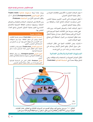 الوحدة األولى: مقدمة في اإلدارة البيئية27● توفر النباتات الخضراء األكسجين للكائنات الحية من خالل عملية التمثيل الضوئي. ● تُطلق الحيوانات ثاني أكسيد الكربون بعملية التنفس الذي تستخدمه النباتات إلنتاج الغذاء والطاقة من خالل عملية التمثيل الضوئي.● توفر النباتات الغذاء والموطن للحيوانات، ومع ذلك، فهي تعتمد بدورها على الكائنات الحية الموجودة في التربة التي تقوم بعملية التحلل، حيث إن عملية التحلل ّلة التي تحتاج هذه تطلق المغذيات من المواد المتحلإليها النباتات للنمو.● تشارك بعض الكائنات الحية في تكاثر النباتات، على سبيل المثال، يلقح النحل األزهار ويساعد في إخصاب نبات من نبات آخر من النوع نفسه.المستويات الغذائية والسالسل الغذائيةّ تتكون العوامل الحيوية من المنتجات والمستهلكات، وهي ً تشغل موقع ً ا محددا في السلسلة الغذائية chain Food .يوجد عادة أربعة مستويات غذائية levels Trophicداخل الهرم البيئي pyramid Ecological( الشكل 1-٦ .)ّ يتكون المستوى األول من المنتجات Producers .ومن األمثلة على المنتجات، النباتات والطحالب والعوالق النباتية، وجميعها تستخدم الطاقة الضوئية )اإلشعاع الشمسي( لتقوم بعملية التمثيل الضوئي وتنتج الغذاء الخاص بها. مصطلحات علميةالسلسلة الغذائية chain Food :تسلسل تغذية الكائنات الحية، ويشير إلى تدفق الطاقة، حيث يتم استهالك أحد األنواع من المستهلك الذي يليه، أي من المنتج عبر السلسلة إلى المفترس العلوي.المستوى الغذائي level Trophic :مجموعة من الكائنات الحية داخل النظام البيئي تمأل المستوى نفسه داخل السلسلة الغذائية.الهرم البيئي pyramid Ecological :رسم يمثل العالقة بين الكائنات الحية في مستويات غذائية مختلفة في النظام البيئي.املنتج Producer :الكائن الحي في السلسلة الغذائية َ الذي ينتج غذاءه من خالل عملية التمثيل الضوئي.الشكل 1-٦ هرم بيئي يوضح كيف يتوافق الصعود عرب املستويات الغذائية مع انخفاض مقدار املغذيات املتوافرة. يتم مترير فقط من الطاقة إىل املستوى التايل، ما يقلل من كمية الطاقة املتوافرة أثناء صعود اهلرم.المستهلكات الثالثيةالمستهلكات الثانوية المستهلكات األولية المنتجاتالمحلالتفقدان حرارةطاقة شمسية