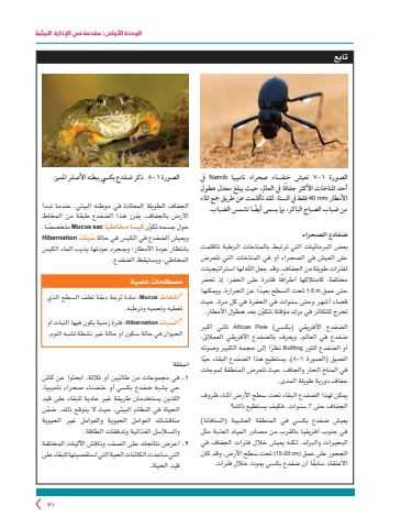 الوحدة األولى: مقدمة في اإلدارة البيئية31تابعالصورة ١-٧ تعيش خنفساء صحراء ناميبيا Namib يف ً أحد املناخات األكثر جفافا يف العامل، حيث يبلغ معدل هطول األمطار mm 40 فقط يف السنة. لقد تأقلمت عن طريق مجع املاء ً من ضباب الصباح الباكر، بام يسمى أيضا تشمس الضباب.ضفادع الصحراءبعض البرمائيات التي ترتبط بالمناخات الرطبة تأقلمت على العيش في الصحراء أو في المناخات التي تتعرض لفترات طويلة من الجفاف. وقد جعل اهلل لها استراتيجيات ً مختلفة، كامتالكها أطرافا قادرة على الحفر؛ إذ تحفر حتى عمق m 5.1 ً تحت السطح بعيدا عن الحرارة. ويمكنها قضاء أشهر وحتى سنوات في الحفرة في كل مرة، حيث ّ تخرج للتكاثر في برك مؤقتة تتكون بعد هطول األمطار. الضفدع األفريقي )بكسي( Pixie African ثاني أكبر ضفدع في العالم، ويعرف بالضفدع األفريقي العمالق، أو الضفدع الثور Bullfrog ً نظرا إلى حجمه الكبير وصوته العميق )الصورة ١-٨ .) ً يستطيع هذا الضفدع البقاء حيا في المناخ الحار والجاف، حيث تتعرض المنطقة لموجات جفاف دورية طويلة المدى.يمكن لهذا الضفدع البقاء تحت سطح األرض أثناء ظروف الجفاف حتى 7 سنوات. فكيف يستطيع ذلك؟يعيش ضفدع بكسي في المنطقة العشبية )السافانا( في جنوب أفريقيا بالقرب من مصادر المياه العذبة مثل البحيرات والبرك. لكنه يعيش خالل فترات الجفاف في الجحور على عمق (cm 20-15 (تحت سطح األرض، وقد كان ً االعتقاد سابقا أن ضفدع بكسي يموت خالل فترات الصورة ١-٨ ذكر ضفدع بكيس ببطنه األصفر املميز.الجفاف الطويلة المعتادة في موطنه البيئي. عندما تبدأ األرض بالجفاف، يفرز هذا الضفدع طبقة من المخاط ّ حول جسمه تكون ً كيسا ً مخاطيا sac Mucus ً متخصصا. ويعيش الضفدع في الكيس في حالة ُسبات Hibernationبانتظار عودة األمطار؛ وبمجرد عودتها يذيب الماء الكيس المخاطي، ويستيقظ الضفدع.مصطلحات علمية*املخاط Mucus :مادة لزجة دبقة تغلف السطح الذي تغطيه وتحميه وترطبه.* ُّ السبات Hibernation :فترة زمنية يكون فيها النبات أو الحيوان في حالة سكون أو حالة غير نشطة تشبه النوم. أسئلةَين أو ثالثة، ابحثوا عن كائن 1 .في مجموعات من طالبحي يشبه ضفدع بكسي أو خنفساء صحراء ناميبيا، اللذين يستخدمان طريقة غير عادية للبقاء على قيد ّ الحياة في النظام البيئي، حيث ال يتوقع ذلك. ضمن مناقشتك العوامل الحيوية والعوامل غير الحيوية والسالسل الغذائية وتدفقات الطاقة.٢ .اعرض نتائجك على الصف، وناقش اآلليات المختلفة التي ساعدت الكائنات الحية التي استقصيتها للبقاء على قيد الحياة.