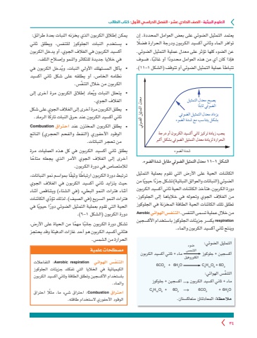 العلوم البيئية - الصف الحادي عشر - الفصل الدراسي األول: كتاب الطالب 34يعتمد التمثيل الضوئي على بعض العوامل المحددة. إن توافر الماء وثاني أكسيد الكربون ودرجة الحرارة فضًلعن الضوء كلها تؤثر على معدل عملية التمثيل الضوئي. ً فإذا كان أي من هذه العوامل محدود ً ا أو غائبا، فسوف تتباطأ عملية التمثيل الضوئي أو تتوقف )الشكل 1-١١.)الكائنات الحية على األرض التي تقوم بعملية التمثيل ً الضوئي )النباتات والعوالق النباتية( تشكل جزء ً ا حيويا من دورة الكربون، فتأخذ الكائنات الحية ثاني أكسيد الكربون من الغالف الجوي وتحوله في خالياها إلى الجلوكوز. تطلق تلك الكائنات الحية الطاقة المخزنة في الجلوكوز من خالل عملية تسمى التنفس. التنفس الهوائي Aerobicrespiration يكسر جزيئات الجلوكوز باستخدام األكسجين وينتج ثاني أكسيد الكربون والماء.يمكن إطالق الكربون الذي يخزنه النبات بعدة طرائق:● يستخدم النبات الجلوكوز للتنفس، ويطلق ثاني أكسيد الكربون في الغالف الجوي، أو يدخل الكربون في خاليا جديدة للتكاثر والنمو وإصالح التلف. ُدخل الكربون في ● يأكل المستهلك األولي النبات، وينظامه الخاص، أو يطلقه على شكل ثاني أكسيد ّ الكربون من خالل التنفس.ُعاد إطالق الكربون مرة أخرى إلى ● يتحلل النبات ويالغالف الجوي.● يطلق الكربون مرة أخرى إلى الغالف الجوي على شكل ً ثاني أكسيد الكربون عند حرق النبات تاركا الرماد. ● يطلق الكربون المختزن عند احتراق Combustionالوقود األحفوري )النفط والفحم الحجري( الناتج من تحجر النباتات. يطلق ثاني أكسيد الكربون في كل هذه العمليات مرة ً أخرى إلى الغالف الجوي األمر الذي يجعله متاحا لالمتصاص في دورة الكربون.ً ترتبط دورة الكربون ارتباط ً ا وثيقا بمواسم نمو النباتات، حيث يتزايد ثاني أكسيد الكربون في الغالف الجوي أثناء فترات النمو البطيء )في الشتاء( ويتناقص أثناء ّ فترات النمو السريع )في الصيف(. لذلك تؤدي الكائنات ً الحية التي تقوم بعملية التمثيل الضوئي دور ً ا حيويا في دورة الكربون )الشكل 1-٩ .)ً تشكل دورة الكربون جانب ً ا مهما من الحياة على األرض، فثاني أكسيد الكربون هو أحد غازات الدفيئة وقد يحتجز الحرارة من الشمس.الشكل 1-١١ معدل التمثيل الضوئي مقابل شدة الضوء.يصبح معدل التمثيل ً الضوئي ثابتايزداد معدل التمثيل الضوئي معدل التمثيل الضوئي بشكل يتناسب مع شدة الضوءشدة الضوء يجب زيادة تركيز ثاني أكسيد الكربون أو درجة الحرارة لزيادة معدل التمثيل الضوئي بشكل أكبر مصطلحات علميةّ التنفس الهوائي respiration Aerobic :التفاعالت الكيميائية في الخاليا التي تفكك جزيئات الجلوكوز باستخدام األكسجين وتطلق الطاقة وثاني أكسيد الكربون والماء.احتراق Combustion :احتراق شيء ما، مثًل احتراق الوقود األحفوري الستخدام طاقته. التمثيل الضوئي:أكسجين + جلوكوز ماء + ثاني أكسيد الكربون6CO2 + 6H2O C6H12O6 + 6O2ّ التنفس الهوائي:ماء + ثاني أكسيد الكربون → أكسجين + جلوكوزC6H12O6 + 6O2 → 6CO2 + 6H2Oمالحظة: المعادلتان متعاكستان.ضوء الشمسالكلوروفيل