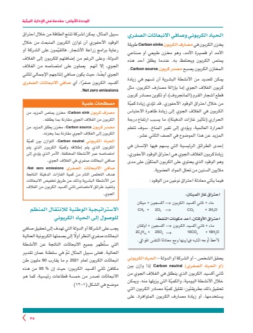 الوحدة األولى: مقدمة في اإلدارة البيئية35الحياد الكربوني وصافي االنبعاثات الصفرييخزن الكربون في مصارف الكربون sinks Carbon طويلة األمد أو قصيرة األمد، وهو مخزن طبيعي أو صناعي يمتص الكربون ويحتفظ به. عندما يطلق أحد هذه المخازن الكربون يصبح مصدر كربون source Carbon .يمكن للعديد من األنشطة البشرية أن تسهم في زيادة كربون الغالف الجوي إما بإزالة مصارف الكربون، مثل قطع أشجار القرم )المانجروف(، أو تكوين مصادر كربون ّ من خالل احتراق الوقود األحفوري. قد تؤدي زيادة كمية الكربون في الغالف الجوي إلى زيادة ظاهرة االحتباس الحراري )تأثير غازات الدفيئة(، ما يسبب ارتفاع درجة الحرارة العالمية، ويؤدي إلى تغير المناخ. سوف تتعلم المزيد عن هذا الموضوع في الصف الثاني عشر. إحدى الطرائق الرئيسية التي يسهم فيها اإلنسان في زيادة كربون الغالف الجوي هي احتراق الوقود األحفوري، ّ وهو الوقود الذي يحتوي على الكربون المتكون على مدى ماليين السنين من تحلل المواد العضوية.َ فيما يأتي معادلة احتراق نوعين من الوقود:احتراق غاز الميثان:ماء + ثاني أكسيد الكربون → أكسجين + ميثانCH4 + 2O2 → CO2 + 2H2Oاحتراق األوكتان، أحد مكونات النفط:ماء + ثاني أكسيد الكربون → أكسجين + أوكتان2C8H18 + 25O2 → 16CO2 + 18H2Oالحظ أوجه الشبه فيام بينها ومع معادلة التنفس اهلوائي.يحقق الشخص - أو الشركة أو الدولة - الحياد الكربوني )أو الحياد الصفري( neutral Carbon إذا وازن بين ثاني أكسيد الكربون الذي ينطلق في الغالف الجوي من ّ خالل األنشطة اليومية، والكمية التي يزيلها منه. ويمكن تحقيق ذلك بطريقتَ ّ ين: تقليل كمية مصادر الكربون التي يستخدمها، أو زيادة مصارف الكربون المتوافرة. على سبيل المثال، يمكن لشركة تنتج الطاقة من خالل احتراق الوقود األحفوري أن توازن الكربون المنبعث من خالل ّ رعاية برامج زراعة األشجار. فالقيمون على الشركة أو الدولة، وعلى الرغم من إضافتهم للكربون إلى الغالف الجوي، إال أنهم يعملون على امتصاصه من الغالف ً الجوي أيضا، حيث يكون صافي إنتاجهم اإلجمالي لثاني ً أكسيد الكربون صفرا، أي صافي االنبعاثات الصفري .Net zero emissionsاالستراتيجية الوطنية لالنتقال المنظم للوصول إلى الحياد الكربونييجب على الشركة أو الدولة التي تهدف إلى تحقيق صافي انبعاثات صفري النظر أوًل إلى بصمتها الكربونية الحالية التي ستُظهر جميع االنبعاثات الناتجة عن األنشطة ّ الحالية. فعلى سبيل المثال تم في سلطنة عمان تقدير انبعاثات الكربون لعام 2021 م ما يقارب 90 مليون طن مكافئ ثاني أكسيد الكربون؛ حيث إن % 95 من هذه االنبعاثات تصدر من خمسة قطاعات رئيسية، كما هو موضح في الشكل )١-١٢ )مصطلحات علميةالكربون من الغالف الجوي مقارنة بما يطلقه. ّ مصرف كربون sink Carbon :مخزن يمتص المزيد من مصدر كربون source Carbon :مخزن يطلق المزيد من الكربون إلى الغالف الجوي مقارنة بما يخزنه.احلياد الكربوني neutral Carbon : ّ التوازن بين كمية ّ الكربون الذي يتم إطالقه وكمية الكربون الذي يتم امتصاصه عبر األنشطة المختلفة، األمر الذي يؤدي إلى صافي انبعاثات صفري في الغالف الجوي.صافي االنبعاثات الصفري emissions zero Net :هدف التخلص التام من كمية الغازات الدفيئة الناتجة من األنشطة البشرية وذلك عن طريق تخفيض االنبعاثات وتنفيذ طرائق المتصاص ثاني أكسيد الكربون من الغالف الجوي.
