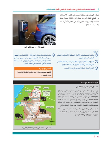 العلوم البيئية - الصف الحادي عشر - الفصل الدراسي األول: كتاب الطالب 38دراسة حالة موسعةماساي مارا: الهجرة الكبرىيهاجر كل سنة أكثر من مليوني حمار وحشي، وحيوان ّ النو وظبي اإليالند وغزال من جنوب محمية سيرينجيتي Serengeti في تنزانيا لتتغذى على أعشاب ماساي مارا Mara Masai في كينيا )الشكل 1-14 .)ال تحدث هذه الهجرة مرة واحدة بين المنطقتَين، بل تشير إلى حركة مستمرة لهذه القطعان الكبيرة على مدار السنة، والتي تعرف بالهجرة الكبرى )الصورة 1-١١ ،)وتغطي مسافة 800 كم بنمط دائري يشبه اتجاه عقارب الساعة أثناء عبورها سيرينجيتي وماساي مارا. حديقة سيرينجيتي الوطنية نهر مارا أغسطس إلى أكتوبر نهر مبالجيتي يناير إلى مارسيوليونوفمبر إلى ديسمبر ماساوا غيم محميةمنطقة نجورونجورو المحمية بحيرة ندوتوتـنزانيــا أبريل إلى يونيو نهر جروميتيشمال سيرينجيتيكـينيــاشش غجمحمية ماساي مارا الوطنيةالشكل ١-14 طرق هجرة القطعان الكبرية. أسئلة٥ّ عرف المصطلحات اآلتية: المنطقة األحيائية، النظام البيئي، الموطن البيئي. ٦ اشـرح كيـف يمكـن أن يؤثـر التغير في معـدل التمثيل الضوئي ّ علـى كميـة ثانـي أكسـيد الكربـون فـي الغلاف الجـوي.٧ اشرح أهمية التمثيل الضوئي في دورة الكربون.٨ّ حد ً د نظام ً ا بيئي ً ا محليا واكتب 150 - 200 كلمة عنه. لخصمعنى المصطلحات العلمية: حيوي، وغير حيوي، وعوامل محددة، وناقش تأثيرها على التنوع البيولوجي. ارسم سلسلة غذائية لألنواع الموجودة في النظام البيئي. أفعال إجرائيةخلص Summarize :اختر وقدم النقاط الرئيسية بدون تفصيل.الصورة 1-10 سيارة كهربائية. يتمثل الهدف في سلطنة عمان في تقليل االنبعاثات من قطاع النقل إلى ما يصل إلى 0 بحلول سنة 2050 م، والسيارات الكهربائية هي الحل األمثل لذلك .)10-1( الصورة)