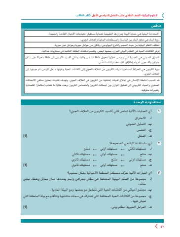 العلوم البيئية - الصف الحادي عشر - الفصل الدراسي األول: كتاب الطالب 42ّ ملخصاالستدامة البيئية هي حماية البيئة ومواردها الطبيعية لحماية مستقبل احتياجات األجيال القادمة والطبيعة.دورة الماء هي تدفق الماء بين اليابسة والمسطحات المائية والغالف الجوي.ّ تختلف النظم البيئية من حيث الحجم والتنوع البيولوجي، وتتكون من عوامل حيوية وعوامل غير حيوية. توفر الكائنات الحية في النظام البيئي الموارد بعضها لبعض، وتقسم تدفقات الطاقة الناتجة في مستويات غذائية.التمثيل الضوئي هي العملية التي يتم من خاللها تحويل طاقة الشمس والماء وثاني أكسيد الكربون إلى طاقة مخزنة على شكل ّ جلوكوز وأكسجين، ثم يتم إطالقها لالستخدام أثناء التنفس.دورة الكربون هي الحركة المستمرة لذرات الكربون من الغالف الجوي إلى الكائنات الحية وخزنها داخل األرض، ثم عودتها إلى الغالف الجوي. قد تتسبب أنشطة اإلنسان في إطالق كميات إضافية من الكربون في الغالف الجوي. وتهدف تقنيات تحقيق صافي االنبعاثات ً الصفري والحياد الكربوني إلى تحقيق التوازن بين انبعاثات الكربون وامتصاص الكربون. وهذه غالب ً ا ما تتطلب استثمار ً ا اقتصاديا وتغييرات سلوكية.أسئلة نهاية الوحدة1 أي العمليات اآلتية تمتص ثاني أكسيد الكربون من الغالف الجوي؟ أ. االحتراق ب. التمثيل الضوئيج. التنفس د. التحلل ]1]٢ أي سلسلة غذائية هي الصحيحة؟أ. مستهلك ثالثي ← مستهلك أولي ← منتجب. منتج ← مستهلك أولي ← مستهلك ثالثيج. مستهلك أولي ← منتج ← مستهلك ثانوي د. منتج ← مستهلك أولي ← مستهلك ثانوي ]1]٣ ّ أي العبارات اآلتية تعرف مصطلح المنطقة األحيائية بشكل صحيح؟أ. مجموعة من النظم البيئية المختلفة في نطاق جغرافي واسع يحددها مناخ مماثل وغطاء نباتي سائد.ب. مجتمع أحيائي من الكائنات الحية التي تتفاعل مع بعضها ومع البيئة المادية. ج. مجموعة من الكائنات الحية المختلفة التي تشترك في سمات متشابهة وتتأقلم مع بيئة المنطقة التي تعيش فيها.د. العوامل الحيوية لنظام بيئي. ]1]