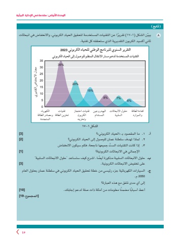 الوحدة األولى: مقدمة في اإلدارة البيئية45)تابع(8 ّ يبين الشكل )1-17 ) ً تقريرا عن التقنيات المستخدمة لتحقيق الحياد الكربوني، واالنخفاض في انبعاثات ثاني أكسيد الكربون التقديرية الذي ستحققه كل تقنية.3530252035 %8% 7% 61050معدل االنخفاض التقديريتقنيات احتجاز الكربون وتخزينهالهيدروجين المستدامحلول االنبعاثات السلبيةكفاءة الطاقة والمواردتقنيات تخزين الطاقةالكهرباء ومصادر الطاقة المتجددةالتقنيات المستخدمة لدعم مسار االنتقال المنظم للوصول إلى الحياد الكربونيالتقرير السنوي للبرنامج الوطني للحياد الكربوني 202317-١ الشكلأ. 1 .ما المقصود بـ »الحياد الكربوني«؟ ]3] 2 .لماذا تهدف سلطنة عمان للوصول إلى الحياد الكربوني؟ ]2] 3 ّ .إذا كانت التقنيات الست جميعها ناجحة، فكم سيكون االنخفاضاإلجمالي في االنبعاثات الكربونية؟ ]1]ب. ً حلول االنبعاثات السلبية مذكورة أيضا. اشرح كيف ستساعد \حلول االنبعاثات السلبية\على تخفيض االنبعاثات الكربونية. ]3]ج. السيارات الكهربائية جزء رئيسي من خطة تحقيق الحياد الكربوني في سلطنة عمان بحلول العام 2050 م. إلى أي مدى تتفق مع هذه العبارة؟ ً أعط أسباب ً ا مضمنا معلومات من أمثلة ذات صلة لدعم إجابتك. ]10]]المجموع: 19]