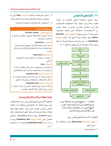 الوحدة الثانية: البحوث البيئية وجمع البيانات51٢-١ المنهج العلمي ً سوف تجري استقصاء لجمع البيانات من البيئة. للقيام بذلك يجب عليك أوًل التخطيط لالستقصاء قبل البدء بالعمل الميداني المناسب. هناك العديد من االستقصاءات المختلفة التي يمكنك اختيارها، والتي يجب أن تتبع جميعها المنهج العلمي Scientific method ّ وهو عملية موحدة تتيح لك اختبار فرضيةHypothesis ما. حتى وإن ثبتت صحة فرضية ما، فإنه يمكن إعادة اختبارها في المستقبل )الشكل ٢-١.)الشكل 2-1 المنهج العلمي يبدأ بمالحظة، ثم يمر بجميع الخطوات إلى أن يتم تقديم نتيجة. يتضمن المنهج العلمي مسار حلقة تغذية راجعة؛ وعندما يثبت خطأ الفرضية يتم إعادة االختبار.ً حاول مرة أخرىالفرضية صحيحة الفرضية غير صحيحةّقدم النتائجالحظاطرح سؤاًلضع فرضية تجيب عن السؤالّحلل البيانات واستخلص االستنتاجاتتنبأ بناء على الفرضيةّنفذ تجربة الختبار التنبؤالخطوات األساسية للمنهج العلمي، هي:١ .إجراء مالحظة Observation تصف مشكلة ما أو طرح سؤال.2 .وضع فرضية.3 .اختبار الفرضية باستخدام البيانات Data التي تم ً جمعها، واستخدام طرائق محددة جيدا للقيام بذلك.4 .استخالص االستنتاجات باستخدام البيانات.مصطلحات علميةالمنهج العلمي method Scientific:إجراء يتضمن المالحظة المنهجية، والقياس، والتجربة الختبار الفرضيات.الفرضية Hypothesis:ُصيغها الباحث ويتنبأ ّ عبارة محددة قابلة لالختبار يبها نتيجة دراسة تم التخطيط لها لإلجابة عن سؤال محدد. المالحظة Observation:مراقبة، أو مشاهدة، أو االنتباه بهدف االستقصاء العلمي.البيانات Data:مجموعة من المعلومات، على شكل حقائق، أو أعداد، أو قياسات، أو إحصائيات، يمكن استخدامها للتحليل.البيانات النوعية data Qualitative:بيانات وصفية، أو غير عددية. يتم جمع هذه البيانات من خالل المالحظات، والمقابالت، ومجموعات التركيز.ّ البيانات الكمية data Quantitative:ّ بيانات عددية، تبي ّ ن الكمي ّ ة، والمدى أو مقدار متغير ما. ّ على سبيل المثال، كمية األمطار الشهرية.المالحظات واألسئلة والفرضياتالخطوة األولى في المنهج العلمي هي إجراء المالحظات. على سبيل المثال، قد تالحظ في منطقة ما أن الغطاء ّ النباتي يتعرض للموت )أي وجود مناطق فيها بقايا ً نباتات ميتة(. في هذه المرحلة، تكون المالحظات غالبا نوعية Qualitative ، ّ وليست كمية Quantitative .وبالتالي نحصل على بيانات نوعية data Qualitative وليست ّ بيانات كمية data Quantitative( الصورة ٢-٢ والجدول .)١-٢