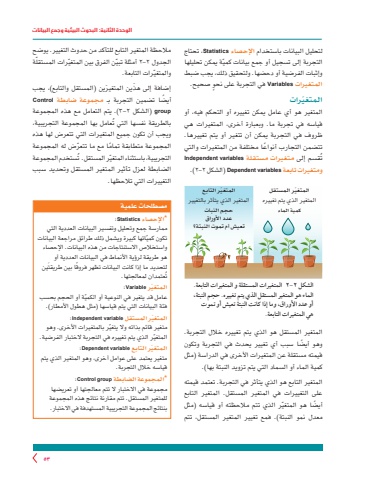الوحدة الثانية: البحوث البيئية وجمع البيانات53لتحليل البيانات باستخدام اإلحصاء Statistics ،تحتاج ّ التجربة إلى تسجيل أو جمع بيانات كمية يمكن تحليلها وإثبات الفرضية أو دحضها. ولتحقيق ذلك، يجب ضبط المتغيرات Variables ٍ في التجربة على نحو صحيح. المتغير هو أي عامل يمكن تغييره أو التحكم فيه، أو ّ المتغيراتقياسه في تجربة ما. وبعبارة أخرى، المتغيرات هي ظروف في التجربة يمكن أن تتغير أو يتم تغييرها. ً تتضمن التجارب أنواعا مختلفة من المتغيرات والتي تُقسم إلى متغيرات مستقلة variables Independent.)2-2 الشكل )Dependent variables تابعة ومتغيراتالشكل 2-٢ المتغيرات المستقلة و المتغيرات التابعة. الماء هو المتغير المستقل الذي يتم تغييره. حجم النبتة، أو عدد األوراق، وما إذا كانت النبتة تعيش أو تموت هي المتغيرات التابعة.ّ المتغير التابعالمتغير الذي يتأثر بالتغييرحجم النبات عدد األوراقتعيش أم تموت النبتة؟ّ المتغير المستقلالمتغير الذي يتم تغييرهكمية الماءالمتغير المستقل هو الذي يتم تغييره خالل التجربة. ً وهو أيضا سبب أي تغيير يحدث في التجربة وتكون قيمته مستقلة عن المتغيرات األخرى في الدراسة )مثل كمية الماء أو السماد التي يتم تزويد النبتة بها(.المتغير التابع هو الذي يتأثر في التجربة. تعتمد قيمته على التغييرات في المتغير المستقل. المتغير التابع ً أيض ّ ا هو المتغير الذي تتم مالحظته أو قياسه )مثل معدل نمو النبتة(. فمع تغيير المتغير المستقل، تتم مالحظة المتغير التابع للتأكد من حدوث التغيير. يوضح ّة الجدول 2 ّ -٢ أمثلة تبي ّ ن الفرق بين المتغيرات المستقلّ والمتغيرات التابعة.َ إضافة إلى هذ َ ين المتغيرين )المستقل والتابع(، يجب ً أيضا تضمين التجربة بـ مجموعة ضابطة Control group( الشكل 2-3 .)يتم التعامل مع هذه المجموعة بالطريقة نفسها التي تُعامل بها المجموعة التجريبية، ويجب أن تكون جميع المتغيرات التي تتعرض لها هذه ً المجموعة متطابقة تمام ّ ا مع ما تتعرض له المجموعة ّ التجريبية، باستثناء المتغير المستقل. تُستخدم المجموعةالضابطة لعزل تأثير المتغير المستقل وتحديد سببالتغييرات التي تالحظها.مصطلحات علمية*اإلحصاء Statistics:ممارسة جمع وتحليل وتفسير البيانات العددية التي ّ تكون كمياتها كبيرة ويشمل ذلك طرائق مراجعة البياناتواستخالص االستنتاجات من هذه البيانات. اإلحصاء هو طريقة لرؤية األنماط في البيانات العددية أو لتحديد ً ما إذا كانت البيانات تظهر فروقا بين طريقتَين تُعتمدان لمعالجتها.ّ المتغير Variable:عامل قد يتغير في النوعية أو ّ الكمية أو الحجم بحسب فئة البيانات التي يتم قياسها )مثل هطول األمطار(.ّ المتغير المستقل variable Independent:ّ متغير قائم بذاته وال يتغير بالمتغيرات األخرى. وهو ّ المتغير الذي يتم تغييره في التجربة الختبار الفرضية.ّ المتغير التابع variable Dependent:متغير يعتمد على عوامل أخرى، وهو المتغير الذي يتم قياسه خالل التجربة.*المجموعة الضابطة group Control:مجموعة في االختبار ال تتم معالجتها أو تعريضها للمتغير المستقل. تتم مقارنة نتائج هذه المجموعة بنتائج المجموعة التجريبية المستهدفة في االختبار.