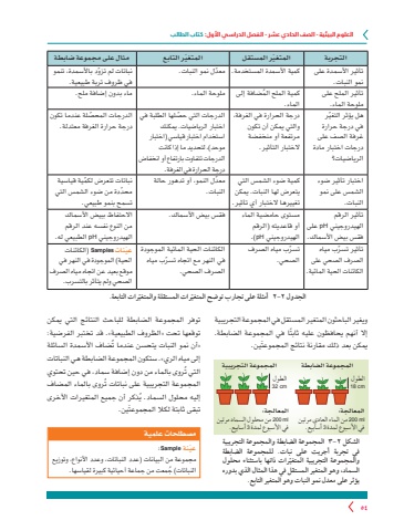 العلوم البيئية - الصف الحادي عشر - الفصل الدراسي األول: كتاب الطالب54مصطلحات علميةّعينة Sample:مجموعة من البيانات )عدد النباتات، وعدد األنواع، وتوزيع ُ النباتات( جمعت من جماعة أحيائية كبيرة لقياسها.ّ المتغي ّ المتغير التابع مثال على مجموعة ضابطة التجربة ر المستقلتأثير األسمدة على نمو النبات.كمية األسمدة المستخدمة. ّ معدل نمو النبات. ّ نباتات لم تزود باألسمدة، تنمو في ظروف تربة طبيعية.تأثير الملح على ملوحة الماء.ُ كمية الملح المضافة إلى الماء.ملوحة الماء. ماء بدون إضافة ملح.ّ هل يؤثر التغير في درجة حرارة غرفة الصف على درجات اختبار مادة الرياضيات؟درجة الحرارة في الغرفة، والتي يمكن أن تكون مرتفعة أو منخفضة الختبار التأثير.ّ الدرجات التي حصلها الطلبة فياختبار الرياضيات. يمكنك استخدام اختبار قياسي )اختبار موحد(، لتحديد ما إذا كانت الدرجات تتفاوت بارتفاع أو انخفاض درجة الحرارة في الغرفة.ّ الدرجات المحصلة عندما تكون درجة حرارة الغرفة معتدلة.اختبار تأثير ضوء الشمس على نمو النبات.كمية ضوء الشمس التي يتعرض لها النبات. يمكن تغييرها الختبار أي تأثير.ّ معدل النمو، أو تدهور حالة النبات.ّ نباتات تتعرض لكمية قياسية ّ محددة من ضوء الشمس التي تسمح بنمو طبيعي.تأثير الرقم الهيدروجيني pH على فقس بيض األسماك.مستوى حامضية الماء أو قاعديته )الرقم الهيدروجيني pH.(فقس بيض األسماك. االحتفاظ ببيض األسماك من النوع نفسه عند الرقم الهيدروجيني pH الطبيعي له. ّ تأثير تسرب مياهالصرف الصحي على الكائنات الحية المائية.ّ تسرب مياه الصرف الصحي.الكائنات الحية المائية الموجودة ّ في النهر مع اتجاه تسرب مياه الصرف الصحي.الحية( الموجودة في النهر في ّعينات Samples( الكائنات موقع بعيد عن اتجاه مياه الصرف الصحي ولم يتأثر بالتسرب.ّرات التابعة.ّرات المستقلة والمتغيالجدول 2-٢ أمثلة على تجارب توضح المتغيويغير الباحثون المتغير المستقل في المجموعة التجريبية ً إال أنهم يحافظون عليه ثابتا في المجموعة الضابطة. يمكن بعد ذلك مقارنة نتائج المجموعتَين.المجموعة التجريبيةالمعالجة:ml 200 من محلول السماد مرتين في األسبوع لمدة 3 أسابيع.الطول 32 cmالمجموعة الضابطةالمعالجة:ml 200 من الماء العادي مرتين في األسبوع لمدة 3 أسابيع.الطول 18 cmالشكل 2-٣ المجموعة الضابطة والمجموعة التجريبية في تجربة أجريت على نبات. للمجموعة الضابطة ّرات ذاتها باستثناء محلول والمجموعة التجريبية المتغيالسماد، وهو المتغير المستقل في هذا المثال الذي بدوره يؤثر على معدل نمو النبات وهو المتغير التابع.توفر المجموعة الضابطة للباحث النتائج التي يمكن توقعها تحت »الظروف الطبيعية«. قد تختبر الفرضية: »أن نمو النبات يتحسن عندما تُضاف األسمدة السائلة إلى مياه الري«. ستكون المجموعة الضابطة هي النباتات التي تُروى بالماء من دون إضافة سماد، في حين تحتوي المجموعة التجريبية على نباتات تُروى بالماء المضاف ُذكر أن جميع المتغيرات األخرى إليه محلول السماد. يتبقى ثابتة لكال المجموعتَين.