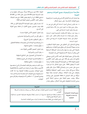 العلوم البيئية - الصف الحادي عشر - الفصل الدراسي األول: كتاب الطالب60ّ العينة ّ مالءمة استراتيجيات جمع العينات وحجم ّ يعد هدف الدراسة العامل األساسي في تحديد استراتيجيةّ جمع العي ُ نات المناسبة. على سبيل المثال:● عند قياس إجمالي المواد السامة التي تلقى في نهر ما: ّ يمكن جمع عينة ماء كبيرة على مدار 24 ساعة لقياس متوسط تركيز المواد السامة في النهر.● َ بينما عند مراقبة االنسكابات العَرضية للمواد السامة: ّ يمكن جمع عي ّ نات ماء فردية بشكل متكرر، على سبيل ّ المثال كل ساعة، لمعرفة التغيرات السريعة في تركيز المواد السامة.ّ يحتاج الباحثون إلى التفكير في حجم العينة المطلوب، ّ ومدى سهولة الوصول إلى موقع جمع العينات، ومعرفتهم بالبيئة التي يتم دراستها والدراسات المماثلة السابقة ّ التي يمكن أن توجه االستراتيجية التي تم اختيارها.ّ بالنسبة إلى حجم العينة، فإن الحد األدنى الذي سيعطي نتائج ذات معنى هو 100 ،في حين يكون الحد األقصى ّ لحجم العينة من الجماعة األحيائية، طالما أن هذا العدد ال يتجاوز 1000 .على سبيل المثال، إذا تم إجراء مسح على خمس مدن بإجمالي 7200 منزل، فلن يكون ً ممكنا مسح كل منزل، بسبب القيود المتعلقة بالتكلفة ً والوقت. في هذه الحالة، سيختار الباحث عادة ّ عينة ّ ممثلة من تلك المنازل الـ 7200 للحصول على بيانات ّ ممث ّ لة. يعتمد حجم العينة على مستوى الدقة الذي يسعى الباحث لتحقيقه. ففي هذا المثال، سيكون مقدار ّ العينة هو مسح 720 منزًل ّ . ومع ذلك، تخيل لو أن ّ هذه المدينة تضم 000 20 منزل، فإن من 000 20تساوي 2000 ،أي أن الرقم تجاوز 1000 ،في هذه الحالة، ّ سيكون الحد األقصى لحجم العينة هو 1000.أما عندما يكون حجم الجماعة األحيائية أقل من 100 ،ّ فإنه يجب تضمين جميع األفراد أو نقاط جمع العينة في المسح. ّ يتم اختيار الحجم األدنى للعينة عندما:● َ يكون كل من الزمن والميزانية محدودين.● ً يكون المطلوب تقدير ً ا تقريبيا.● لن يتم تقسيم البيانات إلى مجموعات مختلفة للتحليل.● ّ توقع إجابات / نتائج مشابهة.ّ يتم اختيار الحجم األقصى للعينة عند:● وفرة الزمن والميزانية.● الحاجة إلى الحصول على النتائج الدقيقة.● إمكانية تقسيم البيانات إلى فروع مختلفة.● ّ توقع إجابات / نتائج مختلفة.سواء أكنت تستخدم طرائقك الخاصة أو التي استخدمها ً اآلخرون سابقا، يجب أن تبحث عن التحيز، والدقة )كيفية جمع البيانات بحرص( وكفاءة العملية وما إذا كانت ّ استراتيجية جمع العينات المستخدمة مناسبة للدراسة. يوضح الجدول 2 ّ -4 ملخص السترتيجيات وطرائق جمع ّ العينات.االستراتيجية الطريقةّ جمع العينات العشوائية باستخدام الطريقة النقطية1ّ .قس ّ م المنطقة المحددة لجمع العينات منها إلى شبكة من مربعات باستخدام أشرطة القياس.2 ً .استخدم أرقام ً ا تم إنتاجها حاسوبي ً ا، أو اسحب أرقاما بطريقة عشوائية؛ لتحديد إحداثيات ّ داخل الشبكة لجمع العينة.3 ّ .اجمع العي ّ نات في نقطة محددة باستخدام أدوات جمع العينات المناسبة.