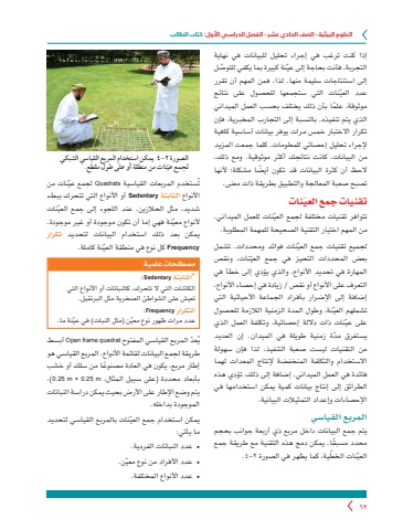 العلوم البيئية - الصف الحادي عشر - الفصل الدراسي األول: كتاب الطالب62الصورة 2-٤ يمكن استخدام المربع القياسي الشبكي ّنات من منطقة أو على طول مقطع.لجمع عيتُستخدم المربعات القياسية Quadrats ّ لجمع عينات من األنواع الثابتة Sedentary أو األنواع التي تتحرك ببطء ّ شديد، مثل الحالزين. عند اللجوء إلى جمع العينات ّ ألنواع معينة فهي إما أن تكون موجودة أو غير موجودة. يمكن بعد ذلك استخدام البيانات لتحديد تكرارFrequency ّ كل نوع في منطقة العينة كاملة.مصطلحات علمية*الثابتة Sedentary:الكائنات التي ال تتحرك، كالنباتات أو األنواع التي تعيش على الشواطئ الصخرية مثل البرنقيل.التكرار Frequency:ّ عدد مرات ظهور نوع معي ّ ن )مثل النبات( في عينة ما.ُ ّعد المربع القياسي المفتوح quadrat frame Open أبسط يطريقة لجمع البيانات لقائمة األنواع. المربع القياسي هو ً إطار مربع، يكون في العادة مصنوعا من سلك أو خشب .)0.25 m × 0.25 m ،المثال سبيل على )محددة بأبعاديتم وضع اإلطار على األرض بحيث يمكن دراسة النباتات الموجودة بداخله.ّ يمكن استخدام جمع العينات بالمربع القياسي لتحديد ما يأتي:● عدد النباتات الفردية.● ّ عدد األفراد من نوع معين.● عدد األنواع المختلفة.إذا كنت ترغب في إجراء تحليل للبيانات في نهاية ّ التجربة، فأنت بحاجة إلى عي ّ نة كبيرة بما يكفي للتوصل إلى استنتاجات سليمة منها. لذا، فمن المهم أن تقرر ّ عدد العينات التي ستجمعها للحصول على نتائج ً موثوقة، علما بأن ذلك يختلف بحسب العمل الميداني الذي يتم تنفيذه. بالنسبة إلى التجارب المخبرية، فإن تكرار االختبار خمس مرات يوفر بيانات أساسية كافية إلجراء تحليل إحصائي للمعلومات. كلما جمعت المزيد من البيانات، كانت نتائجك أكثر موثوقية. ومع ذلك، ً الحظ أن كثرة البيانات قد تكون أيضا مشكلة؛ ألنها تصبح صعبة المعالجة والتطبيق بطريقة ذات معنى.ّ تقنيات جمع العيناتّ تتوافر تقنيات مختلفة لجمع العينات للعمل الميداني. من المهم اختيار التقنية الصحيحة للمهمة المطلوبة.ّ لجميع تقنيات جمع العينات فوائد ومحددات. تشمل ّ بعض المحددات التحيز في جمع العينات، ونقص المهارة في تحديد األنواع، والذي يؤدي إلى خطأ في التعرف على األنواع أو نقص / زيادة في إحصاء األنواع، إضافة إلى اإلضرار بأفراد الجماعة األحيائية التي ّ تشملهم العينة، وطول المدة الزمنية الالزمة للحصول ّ على عينات ذات داللة إحصائية، وتكلفة العمل الذي ّ يستغرق مدة زمنية طويلة في الميدان. إن العديد من التقنيات ليست صعبة التنفيذ، لذا فإن سهولة االستخدام والتكلفة المنخفضة إلنتاج المعدات لهما فائدة في العمل الميداني. إضافة إلى ذلك، تؤدي هذه الطرائق إلى إنتاج بيانات كمية يمكن استخدامها في اإلحصاءات وإعداد التمثيالت البيانية. المربع القياسييتم جمع البيانات داخل مربع ذي أربعة جوانب بحجم ً محدد مسبقا. يمكن دمج هذه التقنية مع طريقة جمع ّ العي ّ نات الخطية، كما يظهر في الصورة 2-٤.