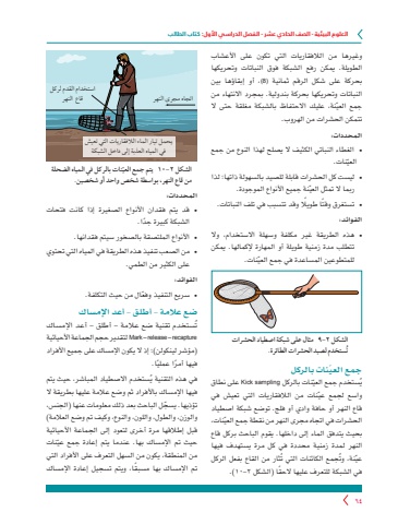 العلوم البيئية - الصف الحادي عشر - الفصل الدراسي األول: كتاب الطالب64وغيرها من الالفقاريات التي تكون على األعشاب الطويلة. يمكن رفع الشبكة فوق النباتات وتحريكها بحركة على شكل الرقم ثمانية (8 ،(أو إبقاؤها بين النباتات وتحريكها بحركة بندولية. بمجرد االنتهاء من ّ جمع العينة، عليك االحتفاظ بالشبكة مغلقة حتى ال تتمكن الحشرات من الهروب.المحددات:● الغطاء النباتي الكثيف ال يصلح لهذا النوع من جمع ّ العينات.● ليست كل الحشرات قابلة للصيد بالسهولة ذاتها؛ لذا ّ ربما ال تمثل العينة جميع األنواع الموجودة.● ً تستغرق وقتا طويًل وقد تتسبب في تلف النباتات. الفوائد:● هذه الطريقة غير مكلفة وسهلة االستخدام، وال تتطلب مدة زمنية طويلة أو المهارة إلكمالها. يمكن ّ للمتطوعين المساعدة في جمع العينات.الشكل 2-٩ مثال على شبكة اصطياد الحشرات ُتستخدم لصيد الحشرات الطائرة.ُ ّ ستخدم جمع العينات بالركل sampling Kick على نطاق ّ جمع العينات بالركليّ واسع لجمع عينات من الالفقاريات التي تعيش في قاع النهر أو حافة وادي أو فلج. توضع شبكة اصطياد ّ الحشرات في اتجاه مجرى النهر من نقطة جمع العينات، بحيث يتدفق الماء إلى داخلها. يقوم الباحث بركل قاع النهر لمدة زمنية محددة في كل مرة يستهدف فيها ّعينة، وتُجمع الكائنات التي تُثار من القاع بفعل الركل ً في الشبكة للتعرف عليها الحقا )الشكل ٢-١٠.)ّنات بالركل في المياه الضحلة الشكل 2-١٠ يتم جمع العيمن قاع النهر، بواسطة شخص واحد أو شخصين.استخدام القدم لركل اتجاه مجرى النهر قاع النهر يحمل تيار الماء الالفقاريات التي تعيش في المياه العذبة إلى داخل الشبكةالمحددات:● قد يتم فقدان األنواع الصغيرة إذا كانت فتحات ً الشبكة كبيرة جدا.● األنواع الملتصقة بالصخور سيتم فقدانها.● من الصعب تنفيذ هذه الطريقة في المياه التي تحتوي على الكثير من الطمي. الفوائد:● ّ سريع التنفيذ وفعال من حيث التكلفة.ضع عالمة - أطلق - أعد اإلمساكتُستخدم تقنية ضع عالمة - أطلق - أعد اإلمساكrecapture – release – Mark لتقدير حجم الجماعة األحيائية )مؤشر لينكولن(؛ إذ ال يكون اإلمساك على جميع األفراد ً فيها أمر ً ا عمليا.ُستخدم االصطياد المباشر، حيث يتم في هذه التقنية يفيها اإلمساك باألفراد ثم وضع عالمة عليها بطريقة ال ّ تؤذيها. يسجل الباحث بعد ذلك معلومات عنها )الجنس، والوزن، والطول، واللون، والنوع، وكيف تم وضع العالمة( قبل إطالقها مرة أخرى لتعود إلى الجماعة األحيائية ّ حيث تم اإلمساك بها. عندما يتم إعادة جمع عينات من المنطقة، يكون من السهل التعرف على األفراد التي ً تم اإلمساك بها مسبقا، ويتم تسجيل إعادة اإلمساك