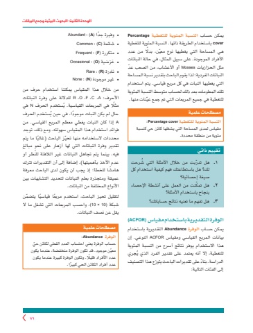 الوحدة الثانية: البحوث البيئية وجمع البيانات71يمكن حساب النسبة المئوية للتغطية Percentage cover باستخدام الطريقة ذاتها. النسبة المئوية للتغطية ّ هي المساحة التي يغطيها نوع معين، بدًل من عدد األفراد الموجودة. على سبيل المثال، في حالة النباتات مثل الحزازيات Mosses ّ أو األعشاب، من الصعب عدالنباتات الفردية؛ لذا يقوم الباحث بتقدير نسبة المساحة التي يغطيها النبات في كل مربع قياسي. يتم استخدام تلك المعلومات بعد ذلك لحساب متوسط النسبة المئوية ّ للتغطية في جميع المربعات التي تم جمع عينات منها.مصطلحات علميةالنسبة المئوية للتغطية cover Percentage:مقياس لمدى المساحة التي يشغلها كائن حي كنسبة مئوية من منطقة محددة.تقييم ذاتي١ ّ .هل تدر ُ بت من خالل األمثلة التي شرحت لك؟ هل باستطاعتك فهم كيفية استخدام كل صيغة إحصائية؟2 ّ .هل تمكنت من العمل على أنشطة اإلحصاء بنجاح باستخدام األمثلة؟ 3 .هل تفهم ما تعنيه نتائج حساباتك؟الوفرة التقديرية باستخدام مقياس (ACFOR(يمكن حساب الوفرة Abundance التقديرية باستخدام بيانات المربع القياسي ومقياس ACFOR النوعي. إن هذا االستخدام يوفر نتائج أسرع من النسبة المئوية ُجري للتغطية، إال أنه يعتمد على تقدير الفرد الذي يً الدراسة. بناء على تقديرات الباحث يتوزع هذا التصنيف إلى الفئات التالية: ● ً وفيرة جدا (A : (Abundant Common : (C) شائعة● Frequent : (F) متكررة● ● َ ع َرضية (O : (OccasionalRare : (R) نادرة● ● غير موجودة (N : (None من خالل هذا المقياس يمكننا استخدام حرف من األحرف: A ،C ،F ،O ،R للداللة على وفرة النباتات ُستخدم الحرف N في مثًل في المربعات القياسية. يُستخدم الحرف ً حال لم يكن النبات موجودا، في حين يA إذا كان النبات يغطي معظم المربع القياسي. من فوائد استخدام هذا المقياس سهولته. ومع ذلك، توجد ّ محددات الستخدامه منها تحي ً ز الباحث )غالبا ما يتم ٍ تقدير وفرة النباتات التي لها أزهار على نحو مبالغ فيه، بينما يتم تجاهل النباتات غير الالفتة للنظر أو عدم األخذ بأهميتها(. إضافة إلى أن التقديرات تترك ً هامشا للخطأ؛ إذ يجب أن يكون لدى الباحث معرفة عميقة ومتجذرة بعلم النباتات لتحديد التشابهات بين األنواع المختلفة من النباتات.ً لتقليل تحيز الباحث، استخدم مربع ً ا قياسي ّ ا يتضمن شبكة (10 × 10 ،(واحسب المربعات التي تشغل ما ال يقل عن نصف النباتات.مصطلحات علميةالوفرة Abundance:ّ حساب الوفرة يعني احتساب العدد الفعلي لكائن حيّ معين موجود. قد تكون الوفرة منخفضة، عندما يكون عدد األفراد قليًل. وتكون الوفرة كبيرة عندما يكون ً عدد أفراد الكائن الحي كبيرا.