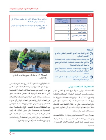 الوحدة الثانية: البحوث البيئية وجمع البيانات73أسئلة9 اشرح الفرق بين المربع القياسي المفتوح والمربع القياسي الشبكي.10 متى يمكنك استخدام مؤشر لينكولن كأداة إحصائية؟ 11 ما الذي يمكن تحديده باستخدام البيانات التي تُجمع بواسطة المربعات القياسية؟12 اشرح كيف يتم استخدام المصائد الشراكية أو جمع ّ العي ّ نات بالركل في الميدان لجمع عينات من األنواع المتنقلة.13 متى يكون استخدام تقنية »ضع عالمة - أطلق - أعد اإلمساك« أكثر مناسبة؟ التخطيط الستقصاء بيئياالستقصاء البيئي عملية تتبع المنهج العلمي. وهوُستخدم لتحديد المخاطر البيئية أو المشكالت القائمة ي)الصورة ٢-١٢ .)قد تتراوح االستقصاءات البيئية ما ّ بين االستقصاءات البيئية السرية )لتحديد ما إذا كان يتم إحداث ضرر بيئي من خالل أنشطة غير قانونية، مثًل(، واستخدام البيانات لضمان أن التطوير المقترح يسبب أقل ضرر بيئي ممكن.يجب أن يبدأ االستقصاء البيئي بسؤال أو مشكلة محددة، ّ ومن هنا يطور الباحث فرضيته. وبمجرد تحديد الفرضية،يجب تصميم خطة لجمع البيانات إلثبات الفرضية أو دحضها.ّنات من التربة في الصورة 2-12 باحث يقوم بجمع عيحقل أناناس.ً عادة ما يكون هناك مبدأ أساسي يدعم الفرضية، على سبيل المثال، قد تكون فرضيتك: »كمية األمطار تتناقص مع مرور الزمن في مدينة صاللة«. المبادئ األساسية التي تدعم هذه الفرضية قد تتضمن مناقشات تتعلق بسجالت وبيانات تغير المناخ في المنطقة والتغيرات في الغطاء النباتي )انخفاض الغطاء النباتي أو حدوث التصحر بسبب الرعي الجائر وزيادة أعداد المواشي في المنطقة أو حدوث التصحر، إلخ(. وقد يثبت أن هذه الفرضية غير صحيحة. على سبيل المثال، قد يكون ً التغير في كمية المياه المتوافرة ناجما عن اإلفراط في استخدامها من قبل الناس في المنطقة، أو زيادة السكان ّ بسبب زيادة أعداد السياح في موسم الخريف.تابعمقياس ACFOR النوع)17 x 3 مربع)سرطان الناسك Nنجم البحر الهش Oقنفذ البحر Rنجم البحر القشاري Rالروبيان N3 ً .اختر مربع ً ا عشوائيا آخر وقم بتقييم وفرة كل نوع باستخدام مقياس ACFOR.٤ .ناقش إيجابيات وسلبيات استخدام طريقة مثل مقياس .ACFOR