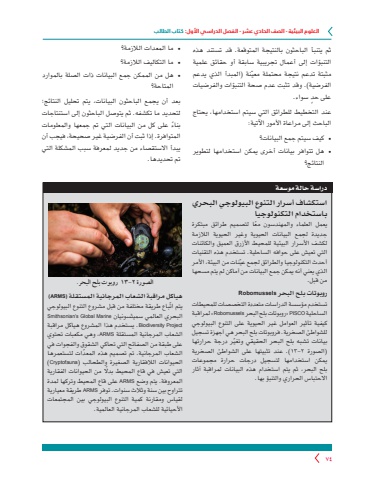 العلوم البيئية - الصف الحادي عشر - الفصل الدراسي األول: كتاب الطالب74ثم يتنبأ الباحثون بالنتيجة المتوقعة. قد تستند هذه التنبؤات إلى أعمال تجريبية سابقة أو حقائق علمية ّ مثبتة تدعم نتيجة محتملة معينة )المبدأ الذي يدعم الفرضية(. وقد تثبت عدم صحة التنبؤات والفرضيات ٍ على حد سواء.عند التخطيط للطرائق التي سيتم استخدامها، يحتاج الباحث إلى مراعاة األمور اآلتية:● كيف سيتم جمع البيانات؟● هل تتوافر بيانات أخرى يمكن استخدامها لتطوير النتائج؟● ما المعدات الالزمة؟● ما التكاليف الالزمة؟● هل من الممكن جمع البيانات ذات الصلة بالموارد المتاحة؟بعد أن يجمع الباحثون البيانات، يتم تحليل النتائج؛ لتحديد ما تكشفه. ثم يتوصل الباحثون إلى استنتاجات ً بناء على كل من البيانات التي تم جمعها والمعلومات المتوافرة. إذا ثبت أن الفرضية غير صحيحة، فيجب أن يبدأ االستقصاء من جديد لمعرفة سبب المشكلة التي تم تحديدها.دراسة حالة موسعةاستكشاف أسرار التنوع البيولوجي البحري باستخدام التكنولوجياً يعمل العلماء والمهندسون معا لتصميم طرائق مبتكرة جديدة لجمع البيانات الحيوية وغير الحيوية الالزمة لكشف األسرار البيئية للمحيط األزرق العميق والكائنات التي تعيش على حوافه الساحلية. تستخدم هذه التقنيات ّ أحدث التكنولوجيا والطرائق لجمع عينات من البيئة، األمر الذي يعني أنه يمكن جمع البيانات من أماكن لم يتم مسحها من قبل. روبوتات بلح البحر Robomusselsتستخدم مؤسسة الدراسات متعددة التخصصات للمحيطاتالساحلية PISCO« روبوتات بلح البحر Robomussels »لمراقبة كيفية تأثير العوامل غير الحيوية على التنوع البيولوجي للشواطئ الصخرية. فروبوتات بلح البحر هي أجهزة تسجيلّ بيانات تشبه بلح البحر الحقيقي وتغير درجة حرارتها )الصورة ٢-١٣ .)عند تثبيتها على الشواطئ الصخرية يمكن استخدامها لتسجيل درجات حرارة مجموعات بلح البحر، ثم يتم استخدام هذه البيانات لمراقبة آثار االحتباس الحراري والتنبؤ بها.الصورة 2-١٣ روبوت بلح البحر.هياكل مراقبة الشعاب المرجانية المستقلة )ARMS)ّ يتم اتباع طريقة مختلفة من قبل مشروع التنوع البيولوجي Smithsonian’s Global Marine سميثسونيان العالمي البحريProject Biodiversity .يستخدم هذا المشروع هياكل مراقبة الشعاب المرجانية المستقلة ARMS ،وهي مكعبات تحتويعلى طبقة من الصفائح التي تحاكي الشقوق والفجوات في ّ الشعاب المرجانية. تم تصميم هذه المعدات لتستعمرها الحيوانات الالفقارية الصغيرة والطحالب )Cryptofauna )التي تعيش في قاع المحيط بدًل من الحيوانات الفقارية المعروفة. يتم وضع ARMS على قاع المحيط وتركها لمدة تتراوح بين سنة وثالث سنوات. توفر ARMS طريقة معيارية لقياس ومقارنة كمية التنوع البيولوجي بين المجتمعات األحيائية للشعاب المرجانية العالمية.