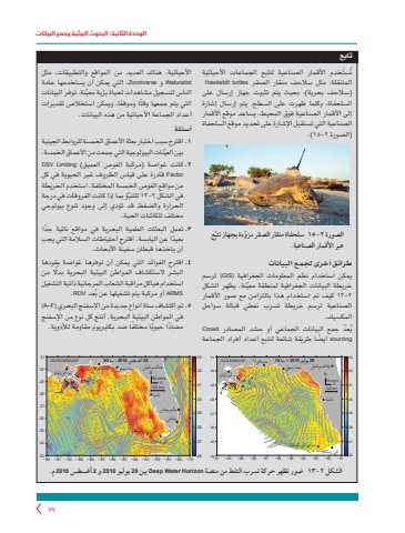 الوحدة الثانية: البحوث البيئية وجمع البيانات77تُستَخدم األقمار الصناعية لتتبع الجماعات األحيائية المتنقلة، مثل سالحف منقار الصقر turtles Hawksbill )سالحف بحرية(، بحيث يتم تثبيت جهاز إرسال على السلحفاة، وكلما ظهرت على السطح، يتم إرسال إشارة إلى األقمار الصناعية فوق المحيط. يساعد موقع األقمار الصناعية التي تستقبل اإلشارة على تحديد موقع السلحفاة .)١٥-٢ الصورة)ّع الصورة 2-١٥ ّ سلحفاة منقار الصقر مزودة بجهاز تتبعبر األقمار الصناعية.طرائق أخرى لجمع البيانات يمكن استخدام نظم المعلومات الجغرافية (GIS (لرسم ّ خريطة البيانات الجغرافية لمنطقة معينة. يظهر الشكل ٢-13 كيف تم استخدام هذا بالتزامن مع صور األقمار الصناعية لرسم خريطة تسرب نفطي قبالة سواحل المكسيك.ُ ّعد جمع البيانات الجماعي أو حشد المصادر Crowdيsourcing ً أيضا طريقة شائعة لتتبع أعداد أفراد الجماعة األحيائية. هناك العديد من المواقع والتطبيقات، مثل iNaturalist و Zooniverse ،التي يمكن أن يستخدمها عامة ّ الناس لتسجيل مشاهدات لحياة بر ّ ية معينة. توفر البيانات ً التي يتم جمعها وقت ً ا وموقعا، ويمكن استخالص تقديرات أعداد الجماعة األحيائية من هذه البيانات.أسئلة ١ .اقترح سبب اختبار بعثة األعماق الخمسة للروابط الجينيةّ بين العينات البيولوجية التي جمعت من األعماق الخمسة.٢ .كانت غواصة )مركبة الغوص العميق( Limiting DSVFactor قادرة على قياس الظروف غير الحيوية في كل من مواقع الغوص الخمسة المختلفة. استخدم الخريطة ّؤ بما إذا كانت الفروقات في درجة في الشكل ٢-13 للتنبالحرارة والضغط قد تؤدي إلى وجود تنوع بيولوجي مختلف للكائنات الحية.٣ ً .تعمل البعثات العلمية البحرية في مواقع نائية جدا ً بعيدا عن اليابسة. اقترح احتياطات السالمة التي يجب أن يتخذها قبطان سفينة األبحاث.٤ .اقترح الفوائد التي يمكن أن توفرها غواصة يقودها البشر الستكشاف المواطن البيئية البحرية بدًل من استخدام هياكل مراقبة الشعاب المرجانية ذاتية التشغيلُعد ROV.ARMS أو مركبة يتم تشغيلها عن ب٥ .تم اكتشاف ستة أنواع جديدة من اإلسفنج البحري (F–A(في المواطن البيئية البحرية. أنتج كل نوع من اإلسفنج ً مضاد ً ا حيوي ً ا مختلفا ضد بكتيريوم مقاومة لألدوية.تابعالشكل 2-13 صور تظهر حركة تسرب النفط من منصة Horizon Water Deep بين 29 يوليو 2010 و 2 أغسطس 2010 م.−92 −91 −90 −89 −88 −87 −86 −85 −84 −83 −82 −81 −80 −792627282930313233OCG/CMS/USF31302928272625242350 cm/s100 kmNE−91 −90 −89 −88 −87 −86 −85 −84 −83 −82 −81 2627282930313233OCG/CMS/USF50 cm/s100 kmNE3130292827262524−92 −91 −90 −89 −88 −87 −86 −85 −84 −83 −82 −81 −80 −792627282930313233OCG/CMS/USF31302928272625242350 cm/s100 kmNE−91 −90 −89 −88 −87 −86 −85 −84 −83 −82 −812627282930313233OCG/CMS/USF50 cm/s100 kmNE3130292827262524نيو أورليانزبنساكوالبنما سيتي تامبا جاكسونفيل دراي تورتوغاز كي وست 18 سا - 2010 يوليو 29بنما سيتي بنساكوال نيو أورليانزتامبا جاكسونفيل دراي تورتوغاز كي وست بالم بيتش ميامي 00 سا - 2010 أغسطس 02