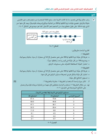 العلوم البيئية - الصف الحادي عشر - الفصل الدراسي األول: كتاب الطالب80تابع٣ ِ رغب عالم بيئة في تحديد ما إذا كانت التربة عند سفح التلة المنحدرة من منجم ذهب غير قانوني ّ ملوثة بالزئبق، فجمع عينات تربة كتلتها g 500 من ثمانية مواقع )مربعات قياسية(، يبعد كل منها عن الذي يليه m 25 ،على طول مقطع يمتد من المنجم نحو األسفل، كما هو موضح في الشكل ٢-14 .مقطع يمتد نحو سفح التلة مربعات قياسية 25 m كلموقع المنجم غير القانوني14-2 الشكلاقترح الباحث طريقتَين: الطريقة 1: ● ّ غربلة كل عينة تربة كتلتها g 500 ٍ على نحو منفصل إلزالة أي حجارة، أو مواد نباتية وحيوانية. ● يوضع g 100 ّ من كل عي ً نة في كيس واحد وخلطها جيدا. ● ّ اختبار العي ّ نة المختلطة للتعرف على مستويات الزئبق. الطريقة ٢: ● ّ غربلة كل عينة تربة كتلتها g 500 ٍ على نحو منفصل إلزالة أي حجارة، أو مواد نباتية وحيوانية. ● ّ اختبار كل عينة بشكل فردي لمعرفة مستوى الزئبق في كل منها. ● ّ تسجيل النتائج لكل عينة. أ. اذكر ميزة واحدة الستخدام الطريقة 1 مقارنة بالطريقة 2.ب. من خالل الطريقة 2 ، َ استخدم الباحث مقطعين كل منهما من ثمانية مربعات قياسية وحصل على النتائج الموضحة في الجدول ٢-7:مستوى الزئبق في التربة )kg / mg من التربة(المربع القياسي المقطع )1 )المقطع )2)81.4 73.8 159.0 45.8 247.1 36.1 322.3 20.4 411.2 9.8 56.1 4.5 63.4 2.2 72.1 0.7 87-2 الجدول]1[