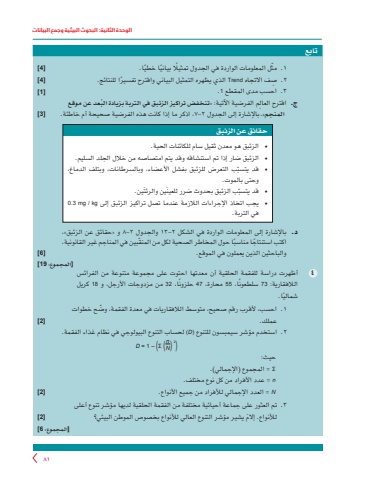 الوحدة الثانية: البحوث البيئية وجمع البيانات81تابع ١ . ّ مثل المعلومات الواردة في الجدول تمثيًل ً بياني ً ا خطيا. 2 . ِ صف االتجاه Trend ً الذي يظهره التمثيل البياني واقترح تفسيرا للنتائج. 3 .احسب مدى المقطع 1.ج. ِ اقترح العالم الفرضية اآلتية: » ُ تنخفض تراكيز الزئبق في التربة بزيادة البعد عن موقعالمنجم«. باإلشارة إلى الجدول 2-٧ ،اذكر ما إذا كانت هذه الفرضية صحيحة أم خاطئة.حقائق عن الزئبق● الزئبق هو معدن ثقيل سام للكائنات الحية.● الزئبق ضار إذا تم استنشاقه وقد يتم امتصاصه من خالل الجلد السليم.ّب التعرض للزئبق بفشل األعضاء، وبالسرطانات، وبتلف الدماغ، ● قد يتسبوحتى بالموت. ّب الزئبق بحدوث ضرر للعينَين والرئتَين. ● قد يتسب● يجب اتخاذ اإلجراءات الالزمة عندما تصل تراكيز الزئبق إلى kg / mg 3.0في التربة.د. باإلشارة إلى المعلومات الواردة في الشكل ٢-١٣ والجدول ٢-٨ و »حقائق عن الزئبق«، ً اكتب استنتاج ً ا مناسب ّ ا حول المخاطر الصحية لكل من المنقبين في المناجم غير القانونية، والباحثين الذين يعملون في الموقع.4 أظهرت دراسة للفقمة الحلقية أن معدتها احتوت على مجموعة متنوعة من الفرائس الالفقارية: 73 ً سلطعونا، 55 محارة، 47 ً حلزونا، 32 من مزدوجات األرجل، و 18 كريل ً شماليا. ١ ّ .احسب، ألقرب رقم صحيح، متوسط الالفقاريات في معدة الفقمة، وضح خطوات عملك. 2 .استخدم مؤشر سيمبسون للتنوع (D (لحساب التنوع البيولوجي في نظام غذاء الفقمة. D = 1 – (Σ (nN) 2) حيث: Σ = المجموع )اإلجمالي(. n = عدد األفراد من كل نوع مختلف. N = العدد اإلجمالي لألفراد من جميع األنواع. 3 .تم العثور على جماعة أحيائية مختلفة من الفقمة الحلقية لديها مؤشر تنوع أعلى َ لألنواع. إالم يشير مؤشر التنوع العالي لألنواع بخصوص الموطن البيئي؟]4[]4[]1[]3[]6[]المجموع: 19]]2[]2[]2[]المجموع: 6]