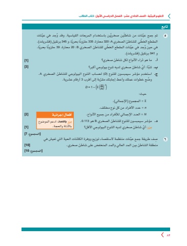 العلوم البيئية - الصف الحادي عشر - الفصل الدراسي األول: كتاب الطالب82تابعَ َّ ين صخري ُ ين باستخدام المربعات القياسية. وقد و ّ جد في عينات ٥ ّ تم جمع عينات من شاطئّ المقطع الخطي للشاطئ الصخري A :320 محارة، 335 ً حلزون ً ا بحريا، و 345 برنقيل )قشريات(. ُ في حين و ّ جد في عي ّ نات المقطع الخطي للشاطئ الصخري B :20 محارة، 39 ً حلزون ً ا بحريا، و 941 برنقيل )قشريات(. أ. ما هو ثراء األنواع لكل شاطئ صخري؟ّ ّ أ: أي شاطئ صخري لديه تنوع بيولوجي أكبر؟ب. تنبج. استخدم مؤشر سيمبسون للتنوع (D (لحساب التنوع البيولوجي للشاطئ الصخري A .ّ وض ّ ح خطوات عملك وأعط إجابتك مقربة إلى أقرب 3 أرقام عشرية.D = 1 – (Σ (nN) 2)حيث: Σ = المجموع )اإلجمالي(. n = عدد األفراد من كل نوع مختلف. N = العدد اإلجمالي لألفراد من جميع األنواع.د. مؤشر سيمبسون للتنوع للشاطئ الصخري B هو 113.0. ّبرر: ّ أي شاطئ صخري لديه التنوع البيولوجي األقل؟٦ِ ص ّ ف طريقة جمع عينات منتظمة الستقصاء توزيع ووفرة الكائنات الحية التي تعيش في منطقة الشاطئ بين المد العالي والمد المنخفض على شاطئ صخري.أفعال إجرائيةباألدلة والحجة. ّبرر Justify :ادعم الموضوع ]2[]1[]المجموع: 7]]1[]3[]10[]المجموع: 10]