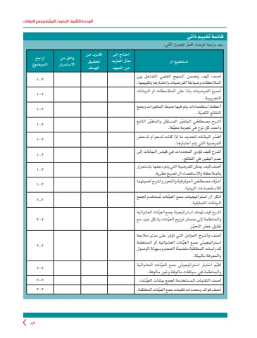 الوحدة الثانية: البحوث البيئية وجمع البيانات83قائمة تقييم ذاتيبعد دراسة الوحدة، أكمل الجدول اآلتي:أستطيع أن أحتاج إلى بذل المزيد من الجهد أقترب من تحقيق الهدفواثق من االستمرارأراجع الموضوعأصف كيف يتضمن المنهج العلمي التفاعل بين المالحظات وصياغة الفرضيات واختبارها وتقييمها. ١-٢ً أصيغ الفرضيات بناء على المالحظات أو البيانات التجريبية.١-٢أخطط استقصاءات يتم فيها ضبط المتغيرات وجمع ٢-١ ّ النتائج الكمية.َ أشرح مصطلح ّ ي المتغي ّ ر المستقل والمتغير التابع ٢-١ ّ وأحدد كل نوع في تجربة معينة.ّ أفسر البيانات لتحديد ما إذا كانت تدعم أو تدحض الفرضية التي يتم اختبارها.١-٢أشرح كيف تؤدي المحددات في قياس البيانات إلى عدم اليقين في النتائج.١-٢أصف كيف يمكن للفرضية التي يتم دعمها باستمرار بالمالحظة واالستقصاء أن تصبح نظرية.١-٢ّ أعر َ ف مصطلحي الموثوقية والتحيز وأشرح أهميتهما لالستقصاءات البيئية.١-٢ّ أذكر أن استراتيجيات جمع العينات تُستخدم لجمع البيانات التمثيلية.٢-2ّ أشرح كيف تهدف استراتيجيتا جمع العينات العشوائية ّ والمنتظمة إلى ضمان توزيع العينات بشكل جيد مع ّ تقليل خطر التحيز.٢-٢أصف وأشرح العوامل التي تؤثر على مدى مالءمة استراتيجيتَ ّ ي جمع العينات العشوائية أو المنتظمة ً للدراسات المختلفة متضمنا الحجم وسهولة الوصول والمعرفة بالبيئة.٢-٢ّ أقيم اختيار استراتيجيتَ ّ ي جمع العينات العشوائية والمنتظمة في سياقات مألوفة وغير مألوفة.٢-٢ّ أصف التقنيات المستخدمة لجمع بيانات العينات. ٢-٢ّ أصف فوائد ومحددات تقنيات جمع العينات المختلفة. 2-٢