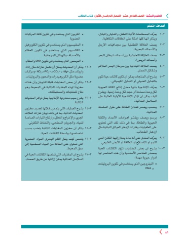 العلوم البيئية - الصف الحادي عشر - الفصل الدراسي األول: كتاب الطالب 86ّ أهداف التعلم٣-١ ّ يعرف المصطلحات اآلتية: التطفل، والتعايش والتبادل، ويذكر أنها كلها أمثلة على العالقات التكافلية. ٣-٢ يصف العالقة التطفلية بين مجدافيات األرجل واألسماك البحرية.٣-3 يصف العالقة التعايشية بين أسماك شيطان البحر وأسماك الريمورا.٣-٤ يصف العالقة التبادلية بين سرطان البحر المالكم وشقائق النعمان.٣-٥ يشرح أن المنتجات يمكن أن تكون كائنات حية تقوم بالتمثيل الضوئي أو التمثيل الكيميائي.٣-٦ ّ يعرف اإلنتاجية بأنها معدل إنتاج الكتلة الحيوية لكل وحدة مساحة أو حجم لكل وحدة زمنية، ويشرح كيف يمكن أن تؤثر اإلنتاجية األولية العالية على السالسل الغذائية.٣-٧ يحسب ويفسر فقدان الطاقة على طول السلسلة الغذائية.٣-٨ ّ يرسم ويصف ويفسر أهرامات األعداد والكتلة الحيوية والطاقة، بما في ذلك تلك التي تحتوي على الطفيليات وفترات ازدهار العوالق النباتية مثل ازدهار الطحالب. ٣-٩ ّ يعرف المغذي على أنه مادة يحتاج إليها الكائن الحي للنمو أو اإلصالح أو الطاقة أو األيض الطبيعي.٣-١٠ يشرح أن بعض المغذيات ّ تزود الكائنات الحية بمصدر للعناصر األساسية وأن هذه العناصر لها أدوار حيوية مهمة: النيتروجين الذي يستخدم في تكوين البروتيناتو DNA الكربون الذي يستخدم في تكوين كافة المركبات العضوية المغنيسيوم الذي يستخدم في تكوين الكلوروفيل الكالسيوم الذي يستخدم في تكوين العظام واألصداف والهياكل المرجانية الفوسفور الذي يستخدم في تكوين DNA والعظام. ،CO2٣-١١ يذكر أن المغذيات يمكن أن تشمل غازات مثل NO3 ، ومركبات -PO4 ،و3-و، CO3 2-وأيونات مثل +Mg2 ،و عضوية مثل الكربوهيدرات والدهون والبروتينات.٣-١٢ يذكر أن بعض المغذيات قابلة للذوبان وأن هناك ً مخزونا لهذه المغذيات الذائبة في المحيط وهو متاح للمنتجات والمستهلكات.٣-١٣ يشرح سبب محدودية اإلنتاجية بفعل توافر المغذياتالذائبة.٣-١٤ يشرح العمليات التي يتم من خاللها تجديد مخزون المغذيات الذائبة، بما في ذلك ذوبان غازات الغالف الجوي، واإلخراج والتحلل، وارتفاع التيارات الصاعدة للمياه، والجريان السطحي، والنشاط التكتوني.٣-١٥ يذكر أن مخزون المغذيات الذائبة ينضب بسبب امتصاصها بواسطة الكائنات الحية.٣-١٦ يلخص كيف ينقل الثلج البحري المواد العضوية التي تحتوي على الطاقة من المياه السطحية إلى عمق المحيط.٣-١٧ يشرح أن المغذيات التي تمتصها الكائنات الحية في السالسل الغذائية يمكن إزالتها عن طريق الحصاد.