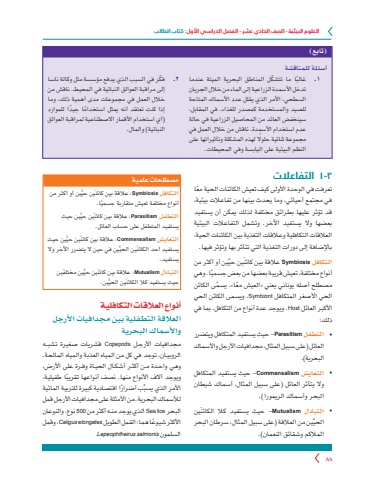 العلوم البيئية - الصف الحادي عشر - الفصل الدراسي األول: كتاب الطالب 88التفاعالت ١-3ً تعرفت في الوحدة األولى كيف تعيش الكائنات الحية معا في مجتمع أحيائي، وما يحدث بينها من تفاعالت بيئية،قد تؤثر عليها بطرائق مختلفة لذلك يمكن أن يستفيد بعضها وال يستفيد اآلخر. وتشمل التفاعالت البيئية العالقات التكافلية وعالقات التغذية بين الكائنات الحية، باإلضافة إلى دورات التغذية التي تتأثر بها وتؤثر فيها. التكافل Symbiosis عالقة بين كائنَ َّ ين حيين أو أكثر من ً أنواع مختلفة، تعيش قريبة بعضها من بعض جسميا. وهي مصطلح أصله يوناني يعني ً »العيش مع ّ ا«. يسمى الكائن الحي األصغر المتكافل Symbiont ،ويسمى الكائن الحي األكبر العائل Host .ويوجد عدة أنواع من التكافل، بما في ذلك:● التطفل Parasitism -حيث يستفيد المتكافل ويتضرر العائل )على سبيل المثال، مجدافيات األرجل واألسماك البحرية(. ● التعايش Commensalism -حيث يستفيد المتكافل وال يتأثر العائل )على سبيل المثال، أسماك شيطان البحر وأسماك الريمورا(.● التبادل Mutualism -حيث يستفيد كال الكائنَين َّ الحيين من العالقة )على سبيل المثال، سرطان البحرالمالكم وشقائق النعمان(.مصطلحات علميةالتكافل Symbiosis :عالقة بين كائنَ َّ ين حيين أو أكثر من ً أنواع مختلفة تعيش متقاربة جسميا.التطفل Parasitism :عالقة بين كائنَ َّ ين حيين حيث يستفيد المتطفل على حساب العائل.التعايش Commensalism :عالقة بين كائنَ َّ ين حيين حيث يستفيد أحد الكائنَ َّ ين الحيين في حين ال يتضرر اآلخر وال يستفيد.التبادل Mutualism :عالقة بين كائنَ َّ ين حي َ ين مختلفين حيث يستفيد كال الكائنَ َّ ين الحيين.أنواع العالقات التكافليةالعالقة التطفلية بين مجدافيات األرجل واألسماك البحريةمجدافيات األرجـل Copepods قشريات صغيرة تشبــه الروبيـان، توجد في كل من المياه العذبة والمياه المالحة. وهي واحـدة مـن أكثـر أشكـال الحيـاة وفـرة على األرض، ً ويوجد آالف األنواع منها. نصف أنواعها تقريبا طفيلية، ِّ األمر الذي يسب ً ب أضرارا اقتصادية كبيرة للتربية المائية لألسماك البحرية. من األمثلة على مجدافيات األرجل قمل البحر lice Sea الذي يوجد منـه أكثر من 500 نوع. والنوعان ً األكثر شيوعا هما: القمل الطويل elongates Caligus ،وقمل .Lepeophtheirus salmonis السلمون)تابع(أسئلة للمناقشة1 ً .غالب ّ ا ما تتشكل المناطق البحرية الميتة عندما تدخل األسمدة الزراعية إلى الماء من خالل الجريانالسطحي، األمر الذي يقلل عدد األسماك المتاحة للصيد والمستخدمة كمصدر للغذاء. في المقابل، سينخفض العائد من المحاصيل الزراعية في حالة عدم استخدام األسمدة. ناقش من خالل العمل في مجموعة ثنائية حلوًل لهذه المشكلة وتأثيراتها على النظم البيئية على اليابسة وفي المحيطات. 2ّ .فكر في السبب الذي يدفع مؤسسة مثل وكالة ناسا إلى مراقبة العوالق النباتية في المحيط. ناقش من خالل العمل في مجموعات مدى أهمية ذلك، وما ً إذا كنت تعتقد أنه يمثل استخدام ً ا جيدا للموارد )أي استخدام األقمار االصطناعية لمراقبة العوالق النباتية( والمال.