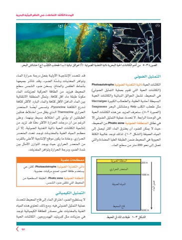 الوحدة الثالثة: التفاعالت في النظم البيئية البحرية93التمثيل الضوئيالكائنات الحية ذاتية التغذية الضوئية Photoautotrophs)الكائنات الحية التي تقوم بعملية التمثيل الضوئي( في المحيط، تشمل الـعوالق النباتيـة والكائنات الحيـة البسيطة أحادية الخلية، والطحالب الكبيرة Macroalgaeِ مثل طحلب الكلب Kelp وحشائش البحر Seagrasses)الصورة 3-5 .)ستعرف المزيد عن هذه الكائنات الحية في الوحدة الرابعة. ال تحدث عملية التمثيل الضوئي إال في نطاق المنطقة الضوئية zone Photic من المحيط، حيث ال يمكن للضوء أن يخترق الماء أكثر ليصل إلى المياه العميقة )الشكل ٣-١ .)لذلك توجد غالبية الكتلة الحيوية في المحيط ضمن الطبقة العليا المضاءة والتي تصل إلى نحو 200 متر من سطح الماء.قـد تتحـدد اإلنتاجيــة األوليـة بفعـل درجـة حـرارة المـاء وتـوافر المغذيـات ّ وشـدة الضـوء، وقـد تتأثـر جميعهـا بأنماط الطقس والمناخ. يسخن ضوء الشمس سطح المحيط فيزيد من الطاقة الحركية لجزيئات الماء ً مكونا طبقة ماء أقل كثافة. وتمثل المنطقة االنتقاليةبين الماء الدافئ األقل كثافة والماء البارد األكثر كثافة تــدرج الكثافـة Pyconcline ً ،وتســمى أيضــا الــمنحدر الحراري Thermocline الــذي يقلل مــن اختــالط هـاتين ّ الطبقتين أو يؤدي إلى اختالط بسيط بينهما. وعلى ً الرغم من أن درجات الحرارة األكثر دفئا قد تزيد من إنتاجية الكائنات الحية ذاتية التغذية الضوئية، إال أن معظــم الـمياه الغنية بالمغذيــات توجـد تحت المنحـدر الحـراري. وعادة ما يكون موقع اإلنتاجية األعلى بالقرب من المنحدر الحراري حيث يوجد التوازن األمثل بين شدة الضوء ودرجة الحرارة وتوافر المغذيات.التمثيل الكيميائيال يستطيع الضوء اختراق الماء إلى قاع المحيط لتحدث عملية التمثيل الضوئي فيه. ومع ذلك، تحتوي هذه المياه الغنية بالمغذيات على مصادر للطاقة الكيميائية توجد في جزيئات مثل كبريتيد الهيدروجين. الكائنات الحية ْلب )ج( حشائش البحر. ِالصورة 3-5 من أهم الكائنات احلية البحرية ذاتية التغذية الضوئية: )أ( عوالق نباتية )ب( طحلب الك)أ( )ب( )ج(مصطلحات علميةذاتي التغذية الضوئية Photoautotrophs :كائن حي يستخدم طاقة الضوء لصنع مركبات عضوية.املنطقة الضوئية zone Photic :الطبقة السطحية من المحيط التي تتلقى ضوء الشمس.1000 m5000 m200 mالشكل 3-١ طبقات املاء يف املحيط.المنطقة الضوئيةالمنحدر الحراريالمياه العميقةقاع المحيطعمق الماء