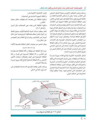 العلوم البيئية - الصف الحادي عشر - الفصل الدراسي األول: كتاب الطالب 96يستخدم بعض الجلوكوز الناتج من عملية التمثيل الضوئي ّ فـي التنفس، وهـذا يـعني أن صـافي اإلنتاجية فقط من ً الكتلة الحيوية يكون متاحا فقط للمستوى الغذائي التالي. وتمر الطاقة المخزنة في الكتلة الحيوية إلى الكائنات غير ذاتية التغذية عندما تتناول وتهضم وتمتص المغذياتمن المنتجات، وعندها يمكن أن يتم التمثيل الغذائي لهذه المغذيات في كتلة حيوية جديدة. ويأكل المستهلك األولي الخلية كلها عندما تكون المنتجات من العوالق النباتية، لذا تُنقل كل الطاقة المتاحة. وبالمقابل، توجد أجزاء ال تؤكل من الطحالب الكبيرة والنباتات الجذرية مثل األعشاب البحرية )الجذور على سبيل المثال(، لذا لن تكون الطاقة المخزنة في هذه األجزاء متاحة إلى المستوى الغذائي التالي، على الرغم من أنها قد تعود إلى النظام البيئي عن طريق التحلل عندما يموت النبات. تـتمثل اإلنتاجيــة الثانويــة بإنتــاج كتلــة حيويــة جديــدة بواسطة المستهلكات. وهـي تشـمل الحيوانـات التي تأكل العوالـق النباتيـة والطحـالب الكبيرة واألعشـاب البحريـة والحيوانات التي تأكل حيوانات أخرى. وتفكك المحلالت مثل البكتيريا والفطريات المادة العضوية الميتة لتحصل على المغذيات ً التـي تحتـاج إليهـا. وهـذا يطـلق أيضـا المغذيـات في النـظام البيئي.تعتمد اإلنتاجية الثانوية على:● الكتلة الحيوية المتاحة في المنتجات.● ّكمية الطاقة التي تفقدها المستهلكات خالل عملية ّ التنفس.● ّكمية الطاقة التـي تفقـد فـي الفضـالت مثـل البـول .)٣-3 الشكل)ّ تفقد معظم أسماك المياه المالحة كميات صغيرة فقط من البول وتفرز معظم فضالتها النيتروجينية على شكل أمونيا عبر الخياشيم. ويتم إخراج الطعام غير المهضوم على شكل براز. يمكن التعبير عن عمليات انتقال الطاقة بالصيغة اآلتية:C = P + R + F + Uحيث )C )الطاقة المستهلكة، و )R )الطاقة المستخدمة ّ في التنفس، و )F )الطاقة الموجودة في البراز، و )U)الطاقة الموجودة في البول وفضالت عمليات األيض األخرى، و )P )الطاقة المتبقية إلنتاج كتلة حيوية جديدة بواسطة الحيوان.وبـذلك تكــون طاقــة اإلنتــاج )P )متاحــة لالنتقــال إلـى المستوى الغذائي التالي.الشكل 3-٣ نقل الطاقة إىل املستهلك ومنه.إمجايل الطاقة يف الطعام املستهلك ّ فقدان احلرارة من خالل التنفس الطاقة التي تفقد يف الفضالت )الرباز والبول( الطاقة املستخدمة يف العمليات احليويةالطاقة املخزنة يف األنسجة