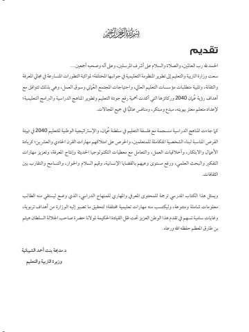 تقديماحلمد هلل رب العاملني، والصالة والسالم ُعىل أرشف املرسلني، وُعىل آله وصحبه أمجعني...سعت وزارة الرتبية والتعليم إىل تطوير املنظومة التعليمية يف جواُنبها املختلفة؛ ملواكبة التطورات املتسارُعة يف جمايل املعرفة والتقاُنة، وتلبية متطلبات مؤسسات التعليم العايل، واحتياجات املجتمع الُعامين وسوق العمل، وهي بذلك تتوافق مع ُ أهداف رؤية ُعامن 2040 وركائزها التي أكدت أمهية رفع جودة التعليم وتطوير املناهج الدراسية والربامج التعليمية؛ ًا يف مجيع املجاالت.إلُعداد متعلم معتز هبويته، مبدع ومبتكر، ومنافس ُعامليُ كام جاءت املناهج الدراسية منسجمة مع فلسفة التعليم يف سلطنة ُعامن، واإلسرتاتيجية الوطنية للتعليم 2040 يف هتيئة الفرص املناسبة لبناء الشخصية املتكاملة للمتعلمني، واحلرص ُعىل امتالكهم مهارات القرن احلادي والعَرِشين؛ كريادة األُعامل واالبتكار، وأخالقيات العمل، والتعامل مع معطيات التكنولوجيا احلديثة وإُنتاج املعرفة، وتعزيز مهارات التفكري والبحث العلمي، ورفع مستوى وُعيهم بالقضايا اإلُنساُنية، وقيم السالم واحلوار، والتسامح والتقارب بني الثقافات.ويمثل هذا الكتاب املدريس ترمجة للمحتوى املعريف واملهاري للمنهاج الدرايس، الذي وضع ليستقي منه الطالب معلومات شاملة ومتنوُعة، وليكتسب منه مهارات تعليمية خمتلفة؛ لتحقيق ما تصبو إليه الوزارة من أهداف تربوية، وغايات سامية تسهم يف تقدم هذا الوطن العزيز حتت ظل القيادة احلكيمة ملوالُنا حرضة صاحب اجلاللة السلطان هيثم بن طارق املعظم حفظه اهلل ورُعاه. د.مدحية بنت أمحد الشيبانيةوزيرة الرتبية والتعليم