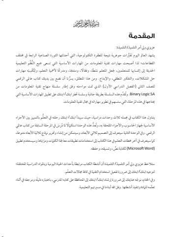 المقدمُةُعزيزي ويل أمر التلميذ/ التلميذة:ريات جوهرية ُنتيجة للطفرة التكنولوجية، التي أحدثتها الثورة الصناُعية الرابعة يف خمتلف يشهد العامل اليوم َتَغرر ُظم التعليمية القطاُعات؛ لذا أصبحت مهارات تقنية املعلومات من املهارات األساسية التي تسعى مجيع النَه مهارات ب�ت ْكسُ�احلديثة إىل إكساهبا للمتعلمني، جلعل املتعلم ُنش ًطا، وفّعاًال، ومنت ًجا، ومدرًكا ألمهية التعلم، ولر حل املشكالت، والتفكري املنطقي، واإلبداع. ومن هذا املنطلق، يُّرسُنا أن ُنضع بني يديك كتاب ُعاملي الرقمي للصف الثاين )الفصل الدرايس األول( الذي متت مواءمته وفق إطار سلسلة منهاج تقنية املعلومات منSA Logic Binary .وُتقَدم هذه السلسلة بطريقة جاذبة وسلسة حتفز ابنك/ ابنتك ُعىل تطبيق املهارات األساسية التي حيتاجها يف هذه املرحلة، التي ستسهم يف تطوير مهاراته يف جمال تقنية املعلومات.لم بالتمييز بني األجزاء ريتناول هذا الكتاب يف جممله ثالث وحدات دراسية، حيث سيبدأ ابنك/ ابنتك رحلته يف التع� َس يف املرحلة السابقة من كتاب ُعاملي د هذه الوحدة استكامًال ملا ُدراألساسية جلهاز احلاسوب واألجزاء امللحقة به، وُتعرالرقمي. ويف الوحدة الثاُنية سيتعرف إىل التصميم ثالثي األبعاد، وسيتمكن من إُنشاء وحترير ُنامذج ثالثية األبعاد متنوُعة، كام سيتعرف يف آخر حمطات التعلم يف هذا الكتاب إىل استخدامات تطبيقات معاجلة الكلامت ومزاياها وسيستخدم تطبيق ٍّص، وتنسيقه، وحفظه.)MicrosoftWord )لكتابة ُن ٍستالحظ ُعزيزي ويل أمر التلميذ/ التلميذة أن أُنشطة الكتاب مرتبطة بأحداث احلياة اليومية وباملواد الدراسية املختلفة؛ لتوجيه ابنك/ ابنتك إىل رضورة تفعيل استخدام التقنية يف كافة جماالت التعّلم.ويف اخلتام، ُنو ّجه ُعنايتك إىل رضورة إرشاد ابنك/ ابنتك إىل املحافظة ُعىل كتابه املدريس، باُعتباره دليَله ومرجَعه يف أثناء تعّلمه للامدة وتنفيذ أُنشطتها. وفق اهلل أبناءُنا يف مسريهتم التعليمية.