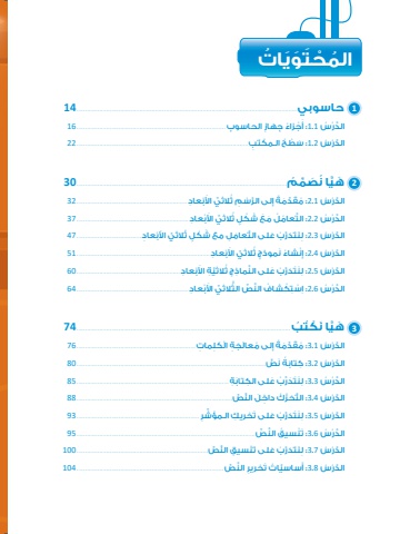 اُتُم ْْحََت ََوَيال ُ1 حاَسَوبي..............................................................................................................................14َ ِْج ُ زاُء ب ِج بهاِز ب الحاسو�.....................................................................................16َ الَّدْْر ُُس 1.1َ :أَ الَّدْْر ُُس 2.1َ :س ْْط ُُح َ الـَم ْْكََت ب�..................................................................................................222َ َ هََّي ُا ُن ََص ِم ُم........................................................................................................................30ُ ِ الثِّي َ اَألْْب بعا�...............................................................32َ الَّدْْر ُُس 1.2َُ :م ََق َِّد ََم ٌٌة ب ِإ َ لى الَّر ْس بِم ثُ ِ الثِّي َ اَألْْب بعا�................................................................37َ الَّدْْر ُُس 2.2 :الََتعا َُم ٍُل َ َم ََع َ َش ْْك ٍٍل ثُ ِ الثِّي َ اَألْْب بعا�.....................................47َ الَّدْْر ُُس 3.2 :بلََن ََت ََّدَْر ْ� َ َعلى الََتعا َُم بٍل َ َم ََع َ َش ْْك ٍٍل ثُ ِ الثِّي َ اَألْْب بعا�............................................................................51َ الَّدْْر ُُس 4.2 ب : ِإَْن ُشاُء َ َنَم ٍ وذٍج ثُ َالثَّي بٌة َ اَألْْب بعا�...........................................................60َ الَّدْْر ُُس 5.2 :بلََن ََت ََّدَْر ْ� َ َعلى الََنَما بذ بٍج ثُ ِ الثِّي َ اَألْْب بعا�................................................................64َ الَّدْْر ُُس 6.2 :با ْسبَت ْْك ُشاُف الََن ِِّص الُّث3َ َ هََّيا َُن ْْكَُت ُ�..........................................................................................................................74َ الَّدْْر ُُس 1.3َُ :م ََق َِّد ََم ٌٌة ب ِإلى َُمعاَل ََج بٌة اْل َْكبلَم ب ا�....................................................................76َ الَّدْْر ُُس 2.3 ب : ِكَتاَْب ٌُة َ َن صِّص............................................................................................................80َ الَّدْْر ُُس 3.3 :بلََن ََت ََّدَْر ْ� َ َعلى ال بْكَتاَْب بٌة.......................................................................................85َ الَّدْْر ُُس 4.3 :الََت َحَُّر ُُك � ب اِخ ٍَل الََن ِِّص.........................................................................................88َ الَّدْْر ُُس 5.3 :بلََن ََت ََّدَْر ْ� َ َع َ لى َت ْحَّر ب يِك الـَم ََؤ َِشبَّر ......................................................................93َ الَّدْْر ُُس 6.3َ : َ ت َْنسَّي ُُق الََن ِِّص......................................................................................................95َ الَّدْْر ُُس 7.3 :بلََن ََت ََّدَْر ْ� َ َع َ لى َت َْنس بَّيُق الََن ِِّص...........................................................................100َ َ ساسَّيا ُ� َ َت ْحَّريبَّر الََن ِِّص....................................................................................104َ الَّدْْر ُُس 8.3َ :أ