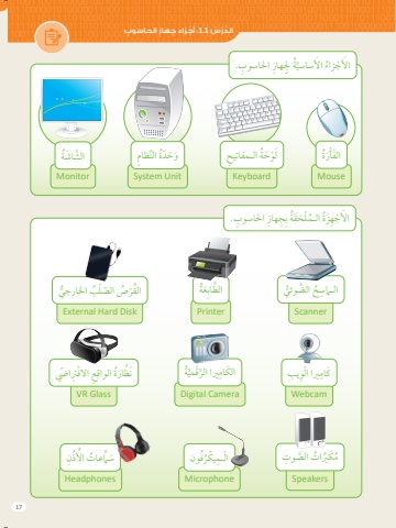 17َ ْْجَز ُ اُء ِْجِه ِاِز الَحاسو ُِبَ الَّدْْر ُُس 1.1َ :أُة ِبِ ِِج ِهاِز ِ احلاسوِب.ُالـُمُّْل ََحََقُة َُُ اَأل ْْجِهََزSpeakersَ الَّص ِوِتِترِّبا ُُ َْك رَمWebcamِريا اْلِويبََكاَمMicrophoneُفونُُِ ْيْكُراْلـُمPrinterُةََعُالَّطاِبَِMonitorُةَُ الَّش َ اَشMouseُةََُْرَ الَفْأUnit Systemالِّن ِظاِمرُةَُو ْْحَدKeyboardُة الـُمَف ِ اتيِحُْ َْحلَوCamera Digitalُةَََُقُميَِريا الُرالَْكاَمHeadphonesُِذنَألُُِت ااَّمعا َُسَScannerَُ الَّضوئيِحِ ُالـاَّمسGlass VRِِع االُْف ِرِت ّ اّيضُِة الواَقَُظاَرََنDisk Hard Externalُب اخلاَرْجيُص ال َّّصُّْل ُْ َُقُرالُُة ِِجِل ِهاِز ِ احلاسوِب.َُُ َ اَألساسيَ اَأل ْْجَزاُء