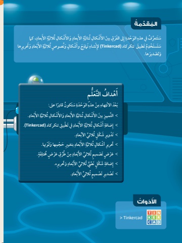 َ اَأل ََد ُ واُتُّ ِمعل التَداف َُّهَْأًرا عىل:ُِ كون قادتَ سَِِ َ الو ْحَدةْن هذهِِ مِهاءَ ْعَد ْ االنتبِ .ْعادبَِ األَّة ثالثيِ َُ ْشكالَ واألِْعادبَِ األَّة ثنائيِ َُ ْشكالالت ِ مييز َ بني األَِّ َ يف ت ْط ِ بيق تنكركاد )Tinkercad.)ْعادبَِ األَّة ثالثيٍ َُ ْشكالِ أِضافةإِ .ْعاد ث ِّالثي األبَُت ْد ِوير َ ش ْك ٍلِ ا.ل ْوهِنِ َ ها وَِ ِ بتغيري َ ح ْجمْعادبَِ األَّة ثالثيٍ َُحَت ِرير ْ أشكالٍ .َفةُِ خُمتلْ ٍض عرِ َُ ق طرُْنِِ مْعادبَ ث ِّالثي األُْ ِضَ ت ْص ٍ ميمَعرِ َ وَحَت ِريره.ْعادبَ ث ِّالثي األُِ َ ش ْك ٍلَ ن ِّ ٍّيِّصِضافةإِ .ْعادبَ ث ِّالثي األَُت ْص ِديرَ ت ْص ٍ ميمِ، كام َبعادِ األَّةثالثيِ َُ ْشكالَواألَِبعادِ األَّةثنائيِ َُ ْشكالِ ب َني األْ قِىل الَفرإِِ الَو ْحدةَّ ُف يف هذهتتعرَسََوَحَتريِرها ِْعادبَِ األَّةثالثيُن ٍ صوٍصٍُ َوَ ْشكالََج وأَِنامِذُِ َتطبيَق تنكركاد )Tinkercadِ ِ )إلْنشاءُِمت ْْخدتسََسََ ها.َوَت ْصديرِقِّد ُمُةال ُِّمTinkercad>