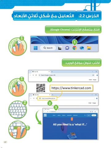 371 انقر بزر الفأرة األيرس1ِا ْفََت َْح َُمََت َُّص ِِف ََح ِ اِإلْنََت َّْرَنت )Chrome Google.)231 1 انقر بزر الفأرة األيرس23ُ ْكَُت ْب ُ ُع ْنَو َ اَن َ َم َْو ِِق ِِع الَويب.اcom.tinkercad.www://httpsُ ِ الثِّي َ اَألْْبعا َِدالَّتعا ُم ٍُل َم ََع َ َش ْْك ٍٍل ثَِّدْْر ُُس2.2 :ال َ