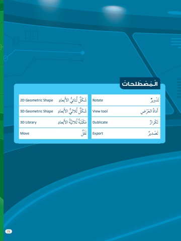 73ِ َِت ُْدِوُيَر Shape Geometric 2D ٌ Rotateَّْعادَّبَي اَألثنائ ٌُُلٌَْش َْكْ ٌِض tool Viewَلَّعَرٌة ا َِ َأ Shape Geometric 3Dَ داَُّْعادَّبَي اَألثالث ٌُُلٌَْش َْكْر Dublicateِ َِت َْكَرا Library 3Dٌ َّْعادَّبَِة اَألَُثالثيُِةٌََتبَ َْكَُمٌل Move ٌ Exportٌَِت ْْصُدُيَر َْنُْق ـ ُِّم َْص ََط ُ لحاُت اْل