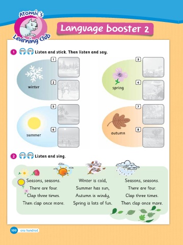 Atomic´s Well done! one hundred and one 6 Language booster 2 It’s windy. The trees are brown. What season is it? Say and play. more Can you describe the four seasons? Write, tick (✔) and stick. Lesson 1, part 1 Lesson 1, part 1 Lesson 1, part 1 Show what you know Winter is cold, Summer has sun, Autumn is windy, Spring is lots o� �un. Language booster 2 1 6 5 2 one hundred and oneone hundred Listen and sing.